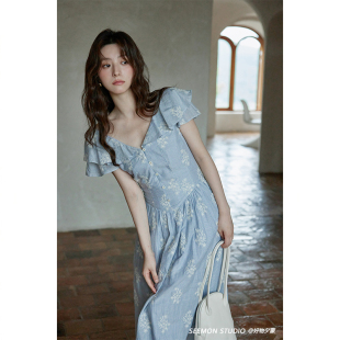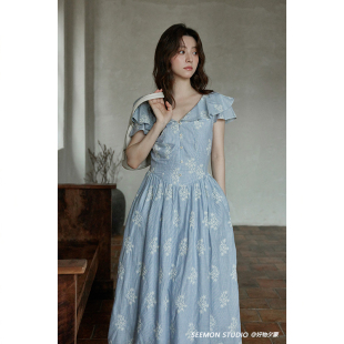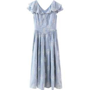 温柔风裙子小个子小众独特蓝色v领条纹连衣裙 夏法式 清仓秒杀