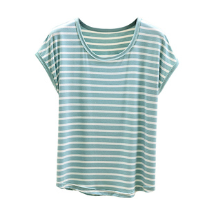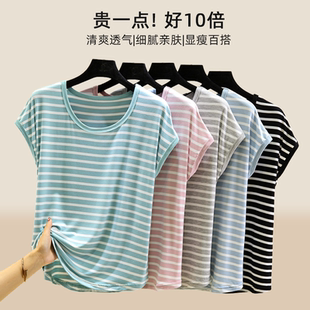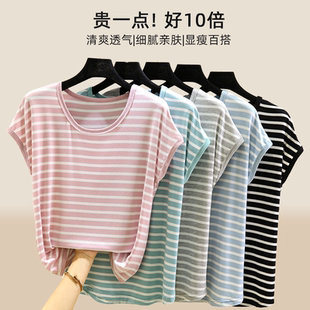 打底衫 无袖 休闲打底上衣宽松条纹圆领短袖 T恤女夏薄款 莫代尔大码