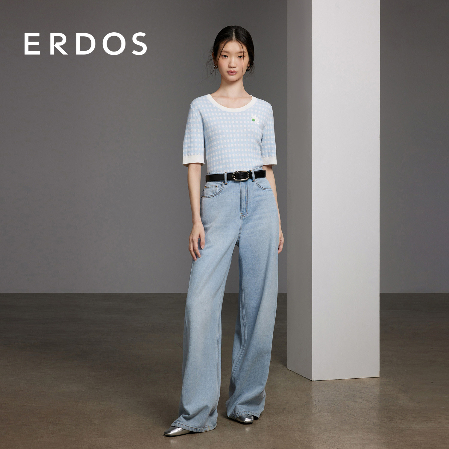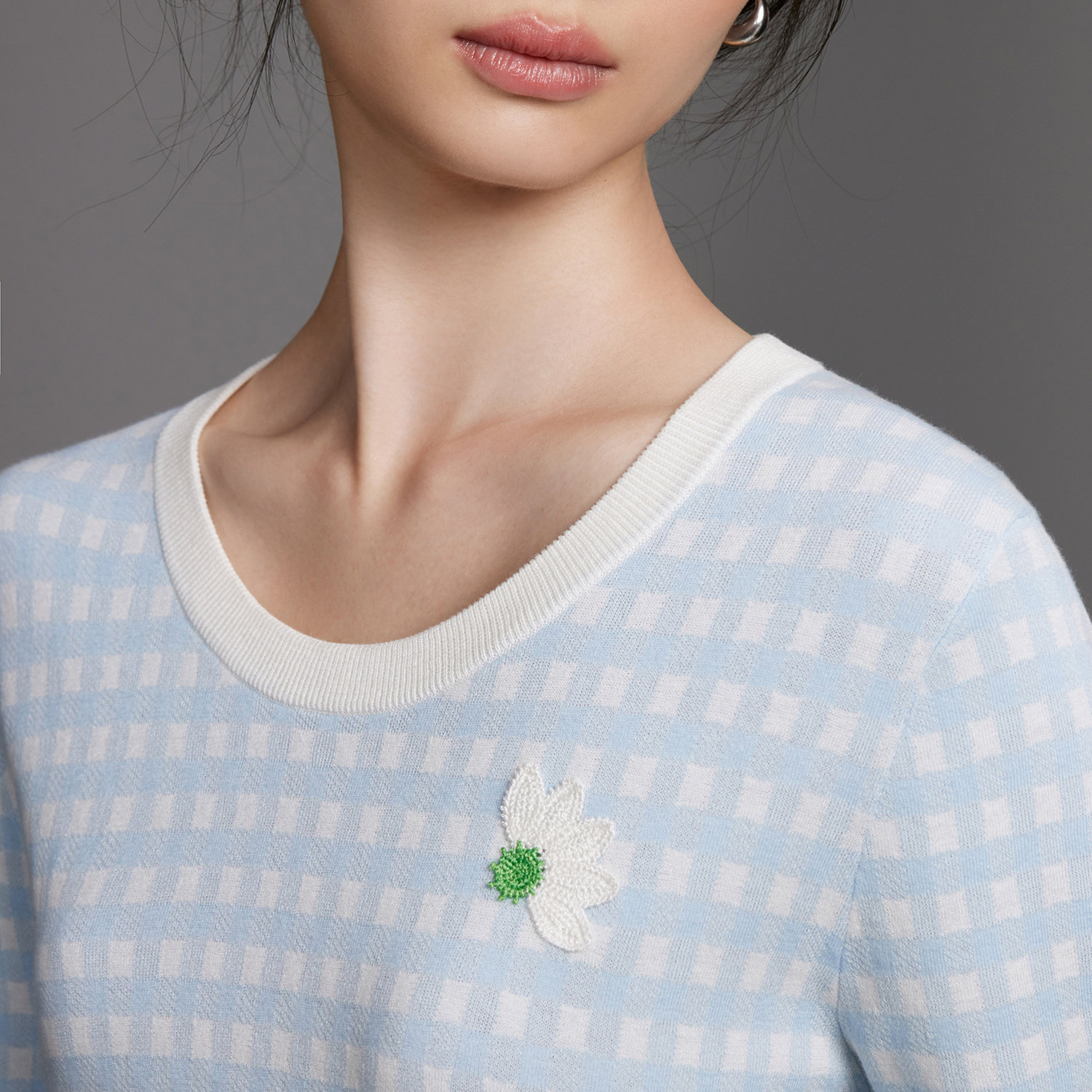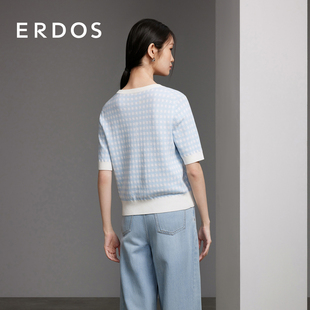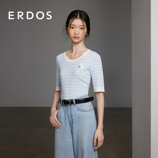 蓝色格纹套衫 夏女复古法式 圆领双提刺绣针织短袖 ERDOS