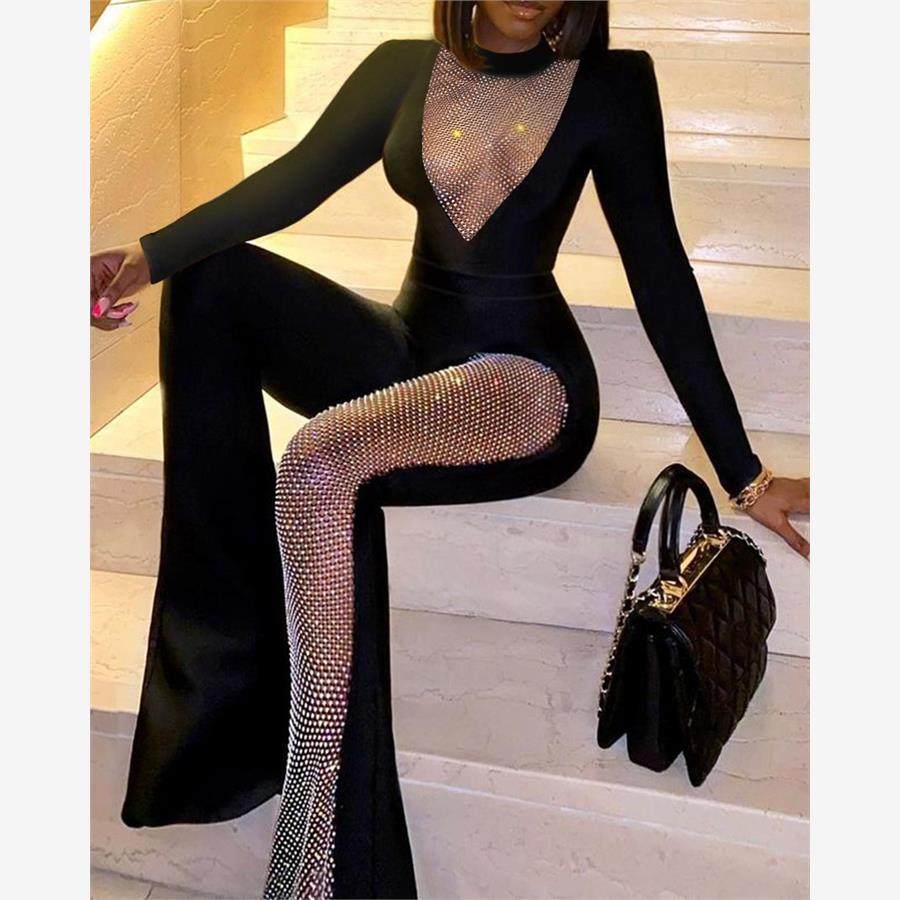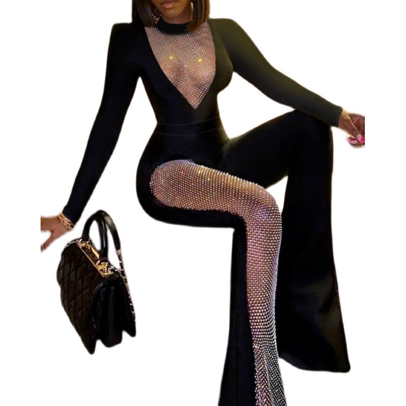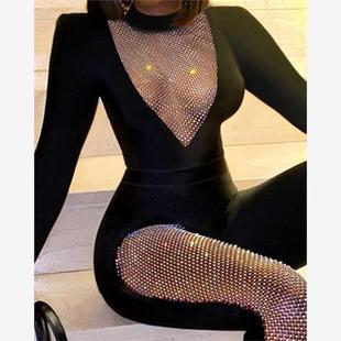 Fishnet Jumpsuit镂空网钻连体裤 Patch Leg Flared Rhinestone