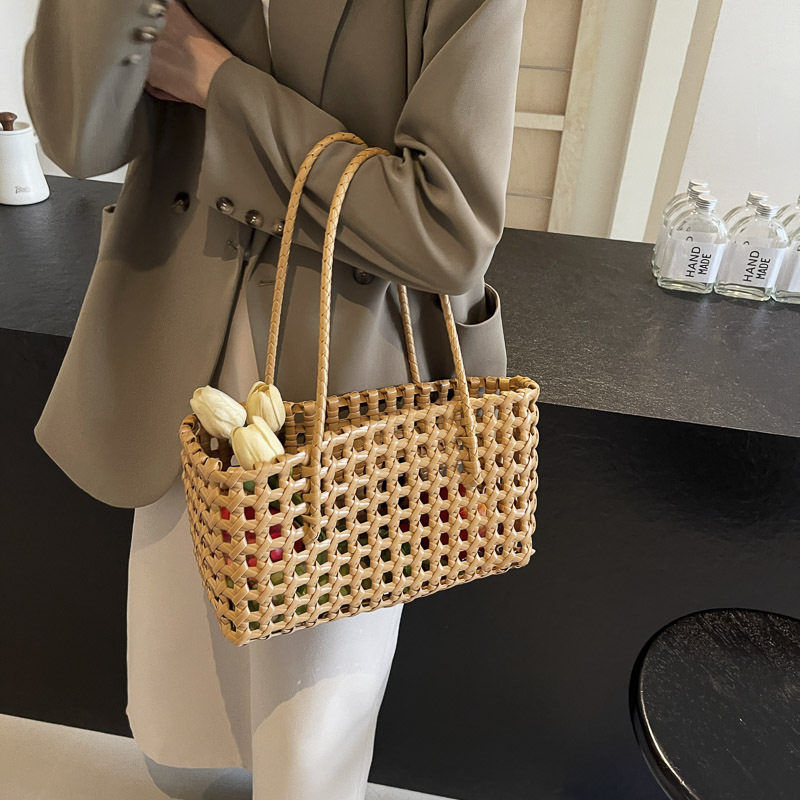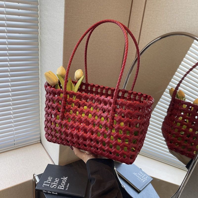 新款 手工编织草编包女度假沙滩包大容量托特包镂空设计PVC菜篮子