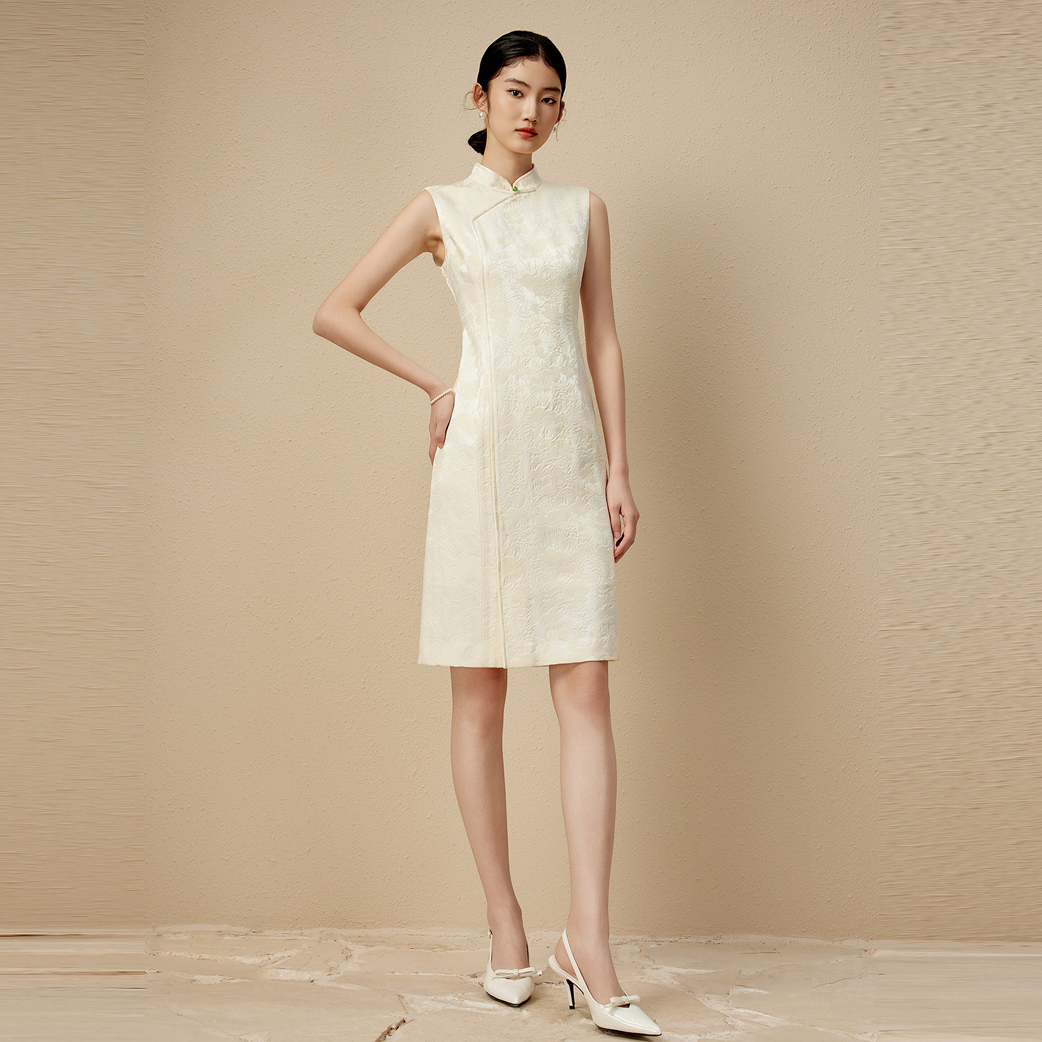 朗姿集团LIME莱茵新中式 旗袍连衣裙米白色气质立领收腰国风提花裙