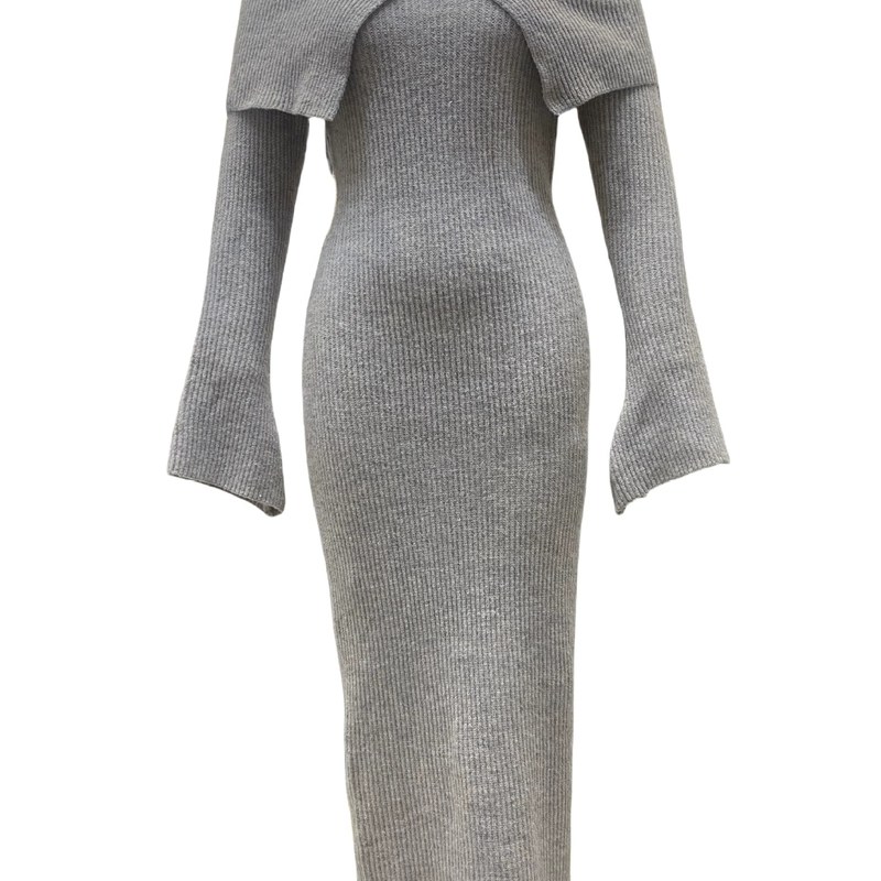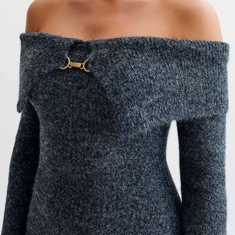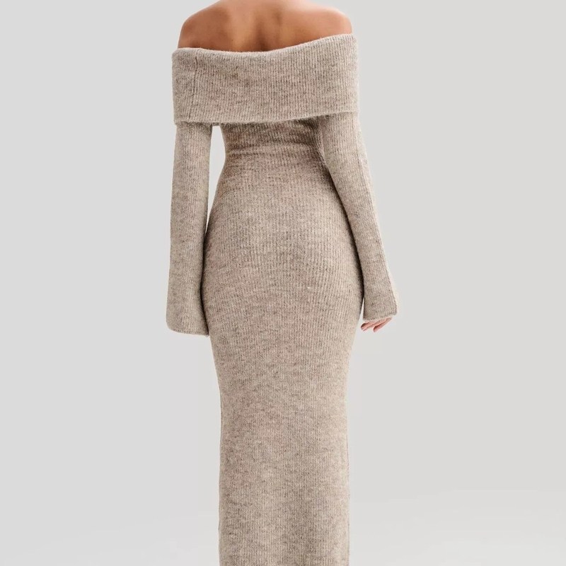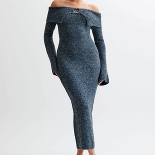 wildgirl秋冬气质修身 长裙连衣裙毛衣女 针织毛衣一字肩包臀喇叭袖