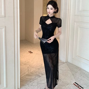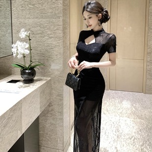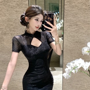 新中式 包臀开叉网纱长裙 国风旗袍连衣裙女技师服纯欲性感约会修身