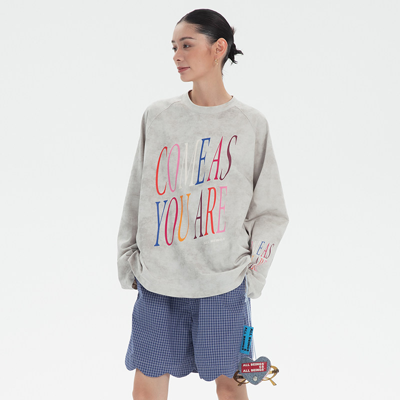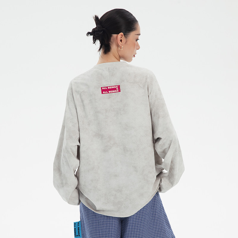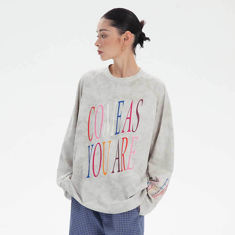BEINGS24AW宽松印花圆领灰色洗水插肩长袖 ALL T恤 吴佳怡同款