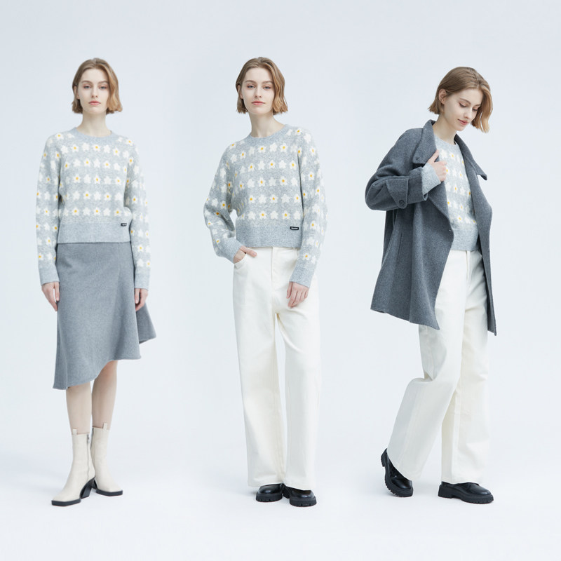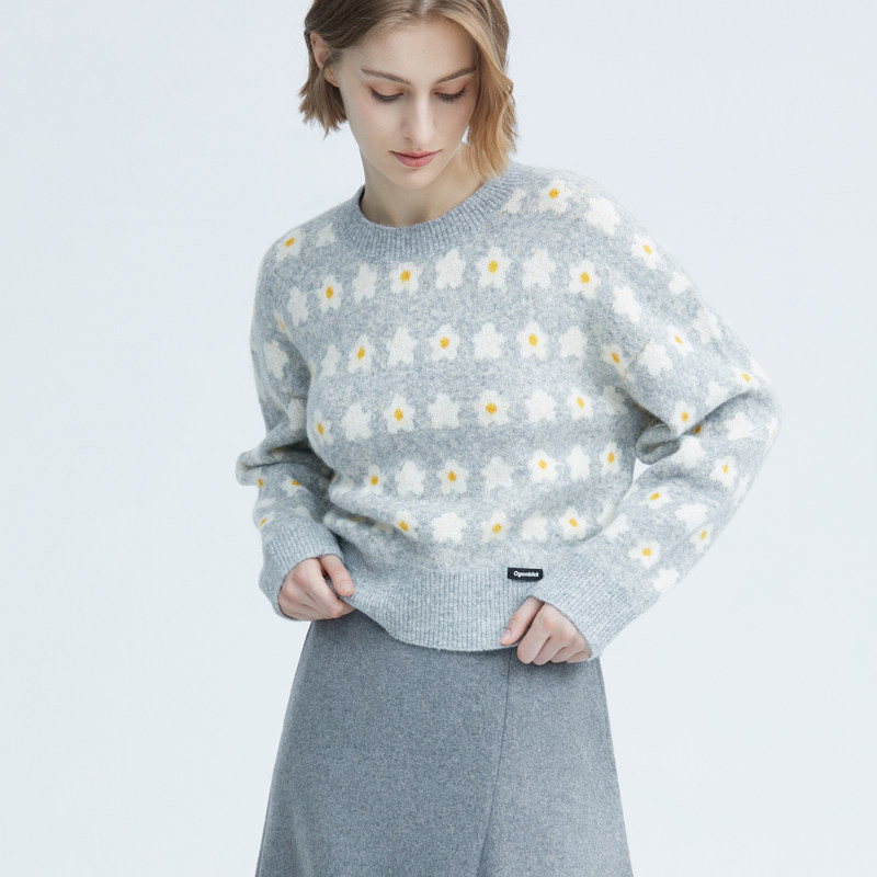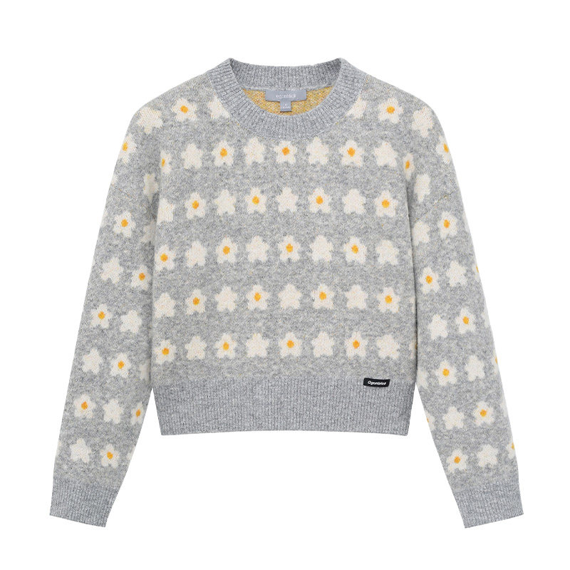 慵懒高级感碎花套头针织衫 北欧时刻灰色圆领厚毛衣女春季 2025新款