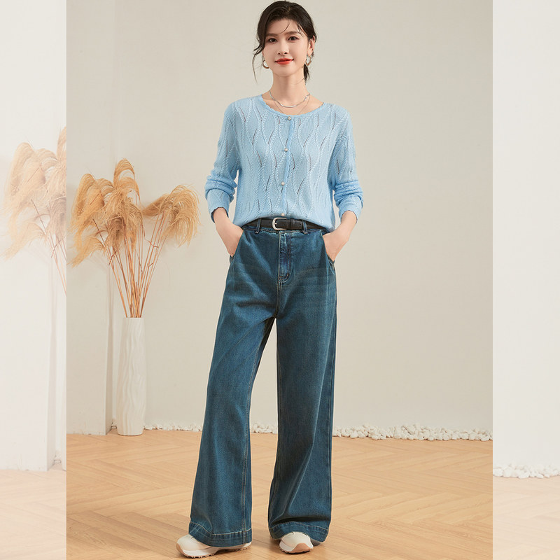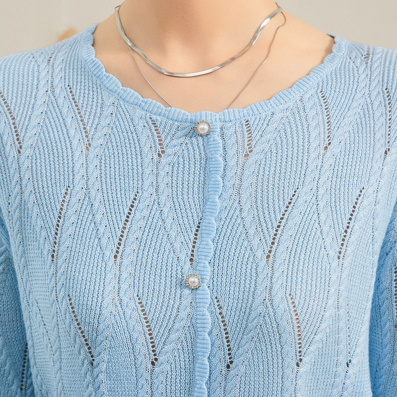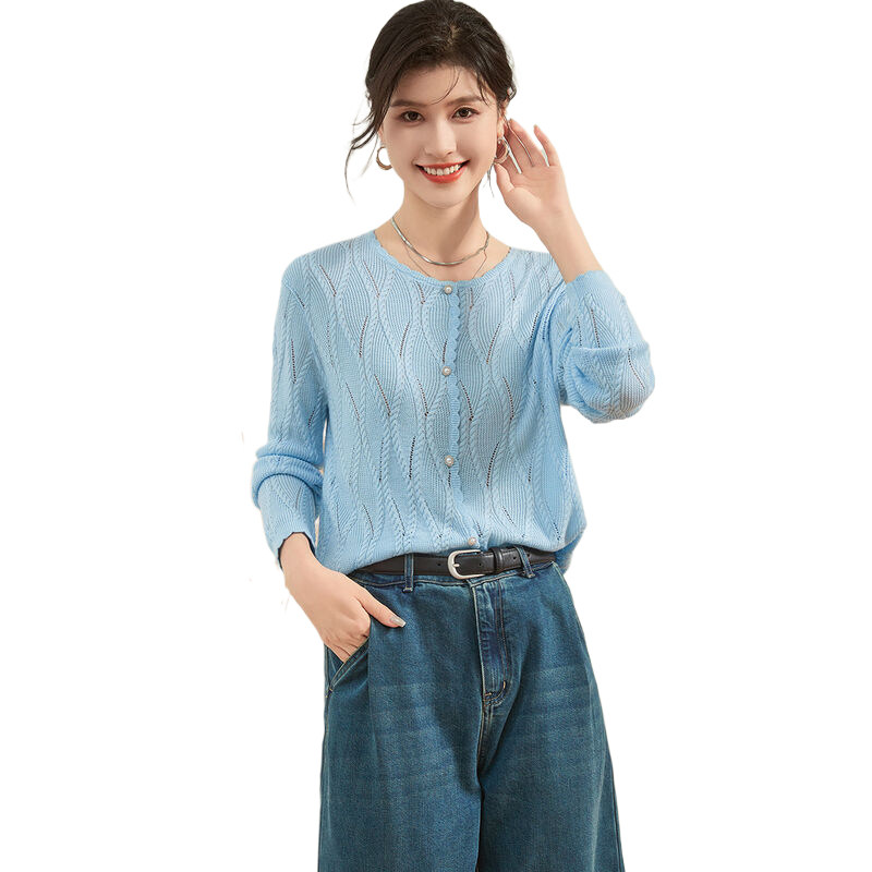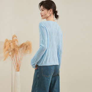 镂空通勤女式 长袖 早秋圆领花边纯色空调衫 针织衫 含桑蚕丝遮阳