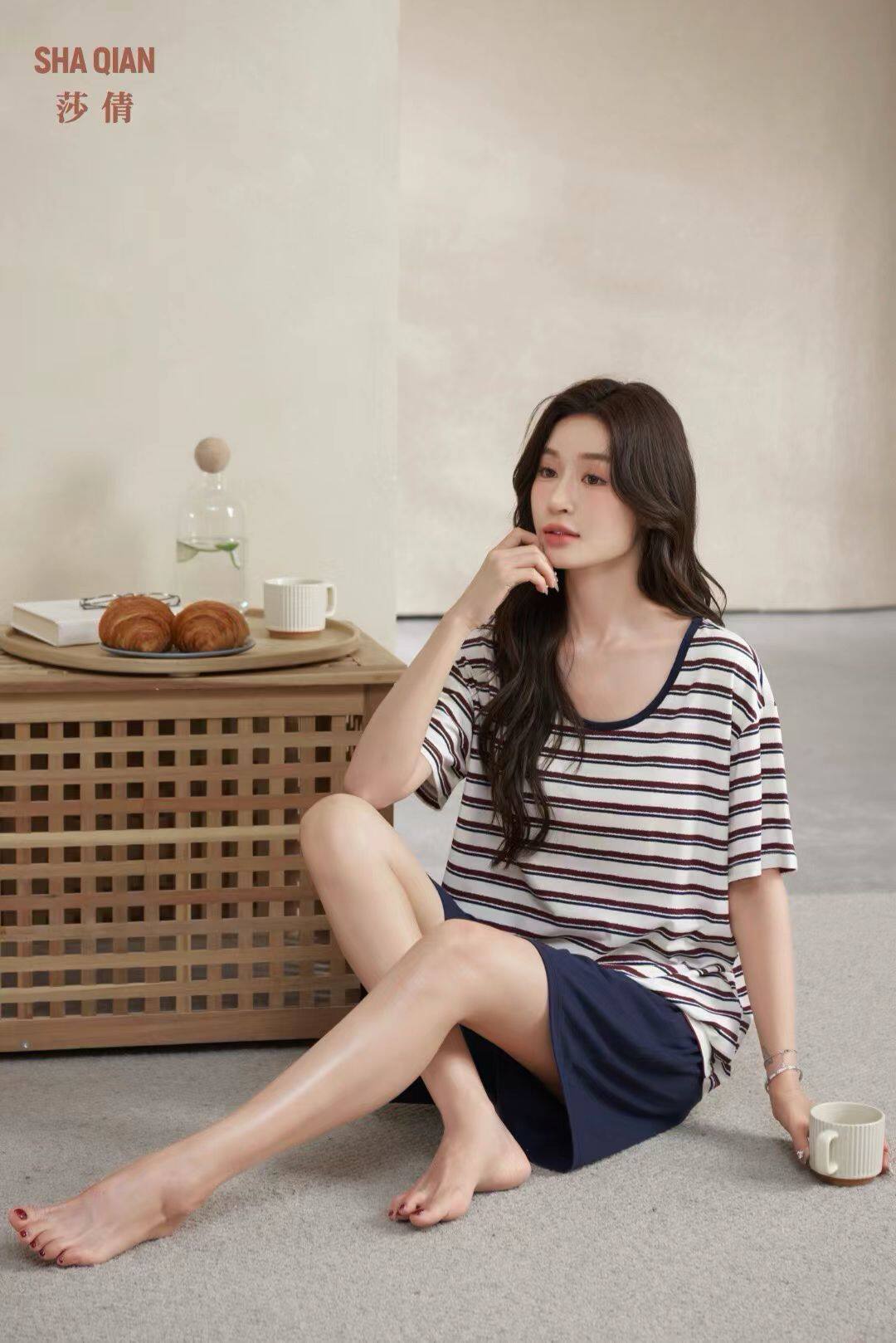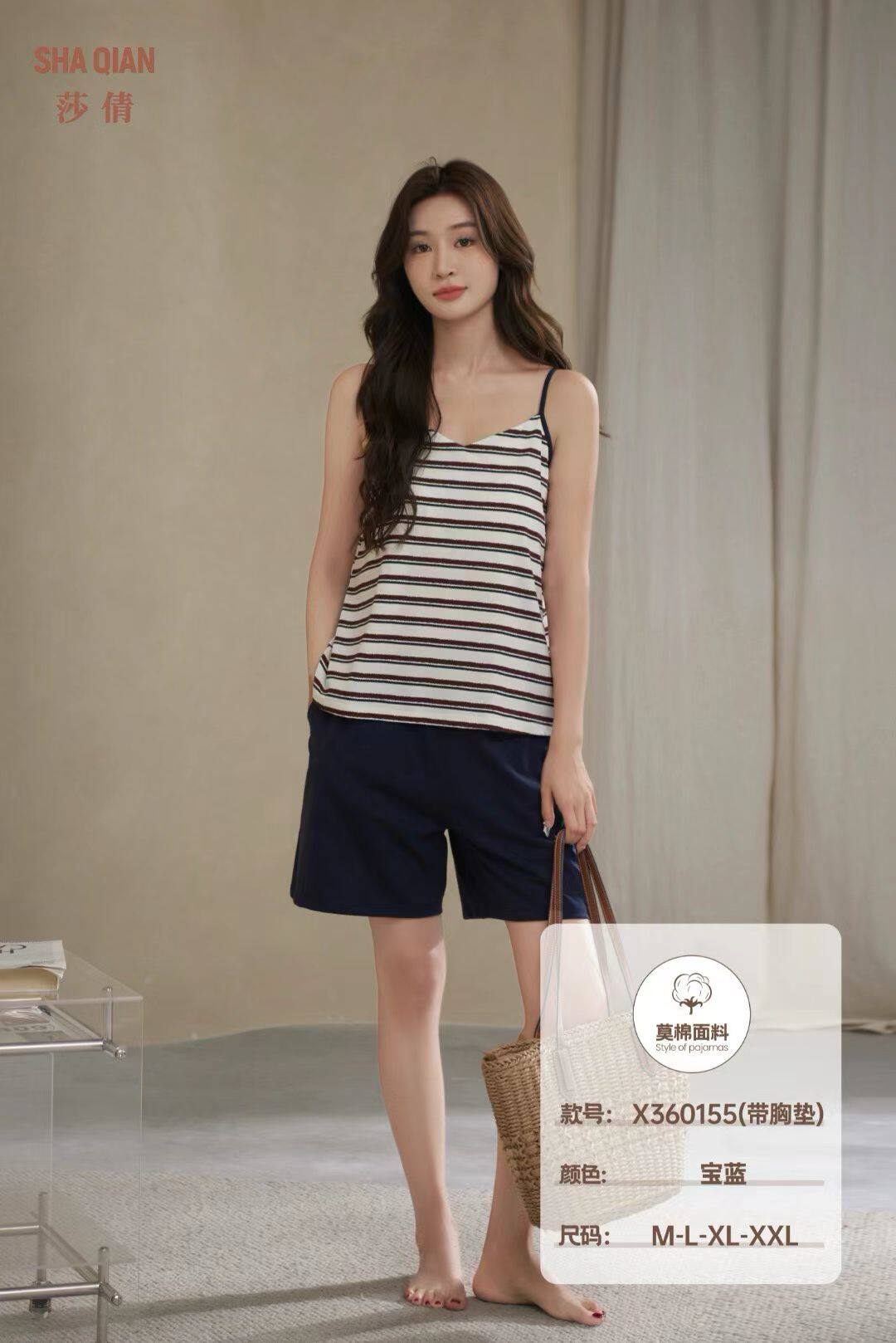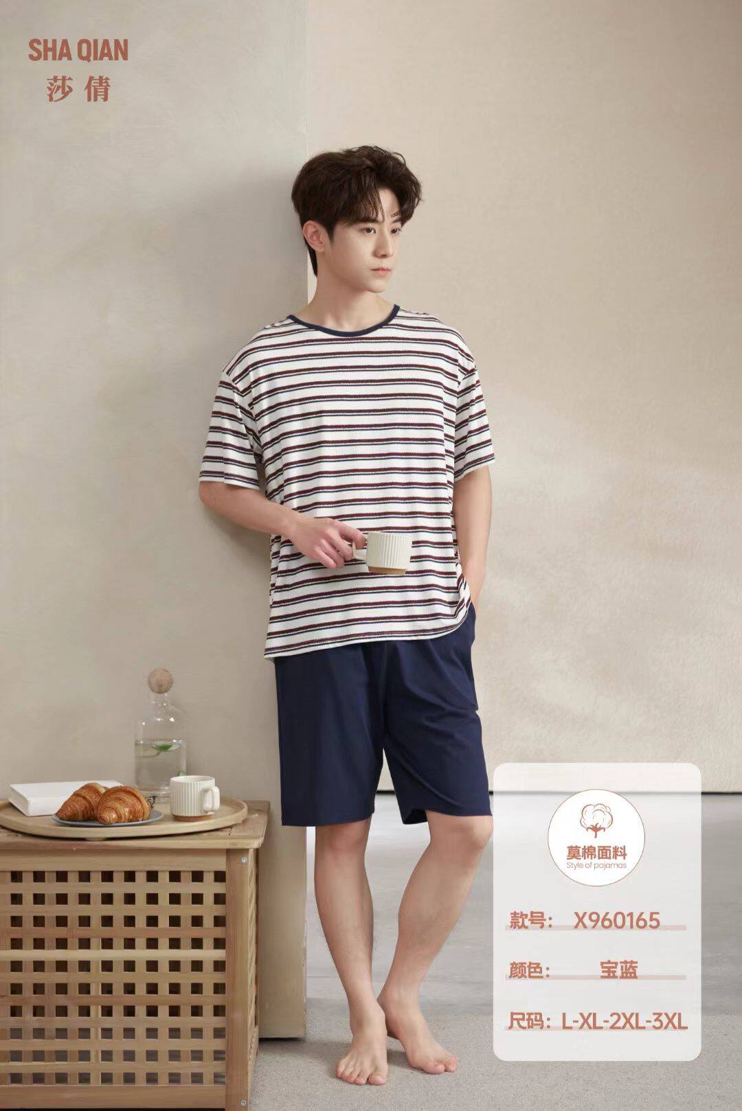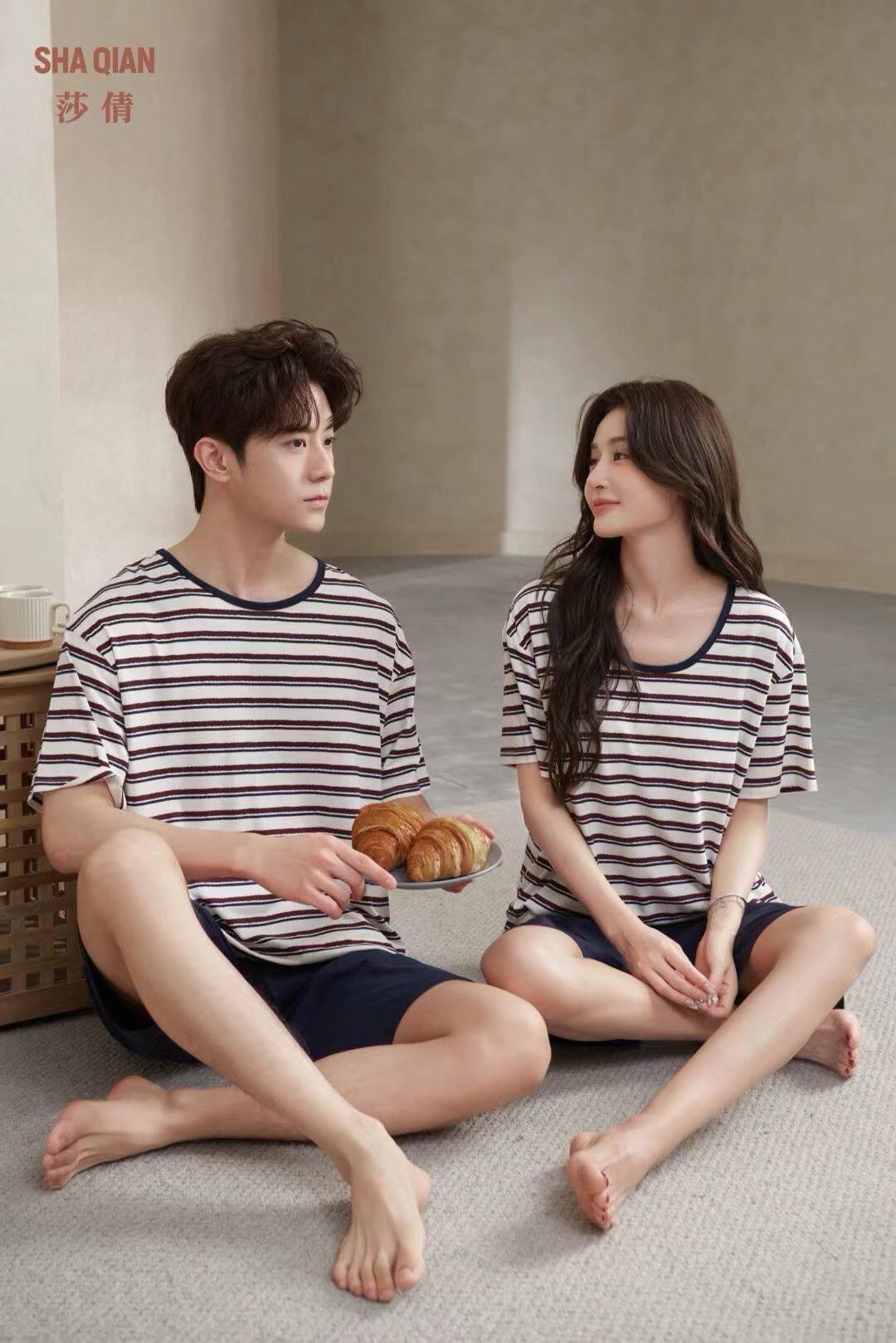 家居服睡衣套装 莎莱雅男女情侣夏季 短裤 莫棉条纹短袖 新款
