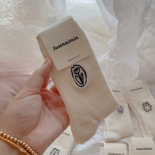 可爱卡通刺绣白色袜子春夏韩国jk棉袜条纹女中筒日系堆堆袜特价