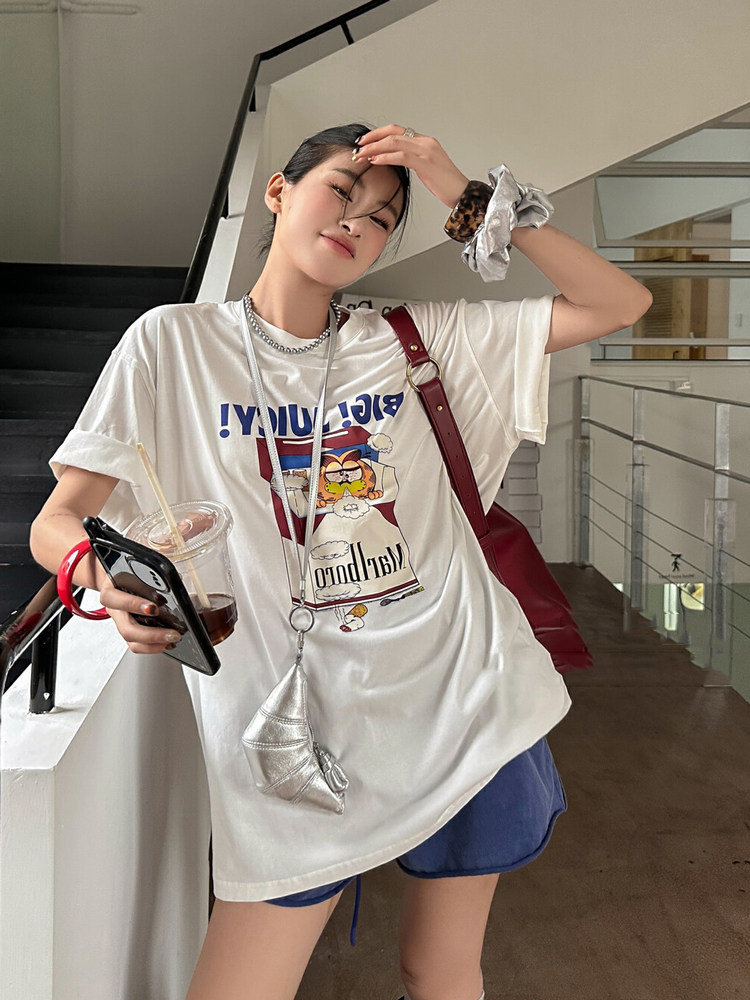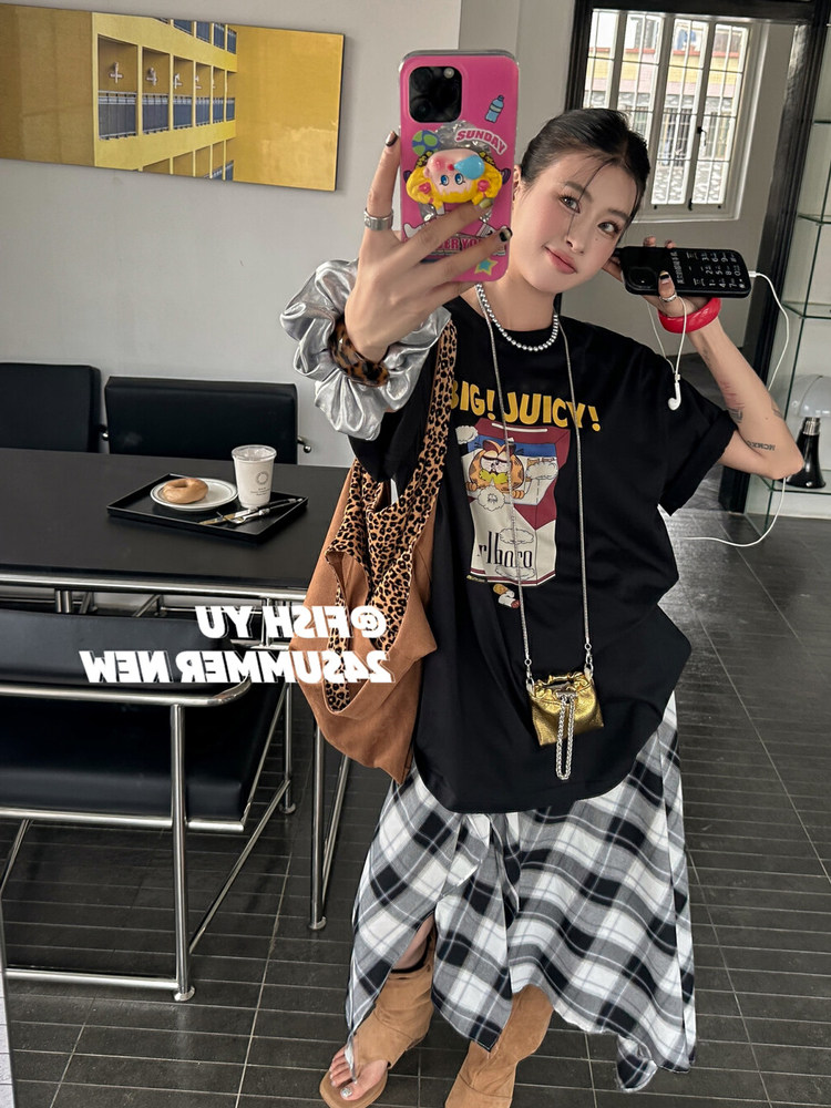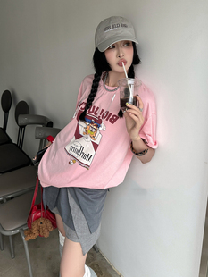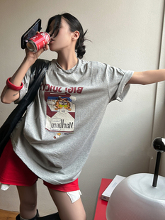 休闲潮牌短袖 夏季 复古汤姆猫字母印花中长款 T恤女2025美式 新款