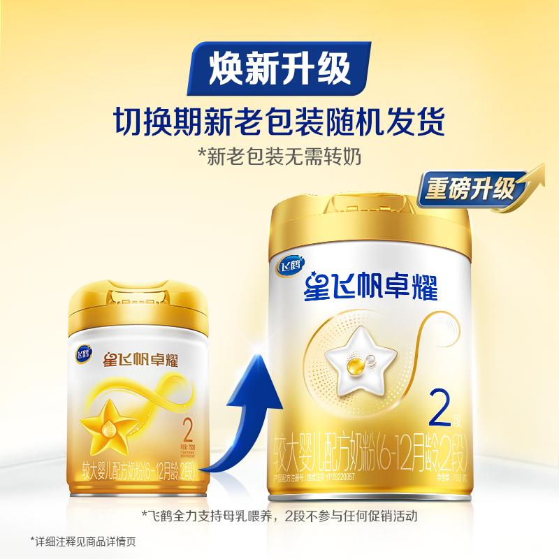 酪蛋白奶源二段正品 育儿补贴 飞鹤星飞帆卓耀2段奶粉750gA2β