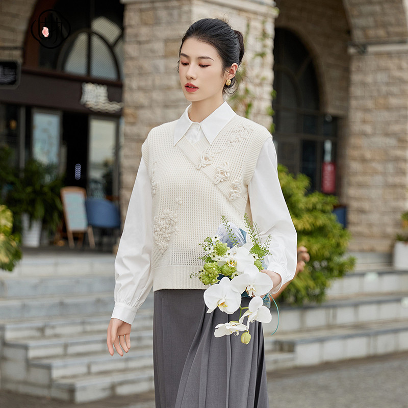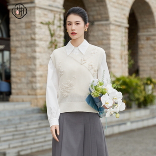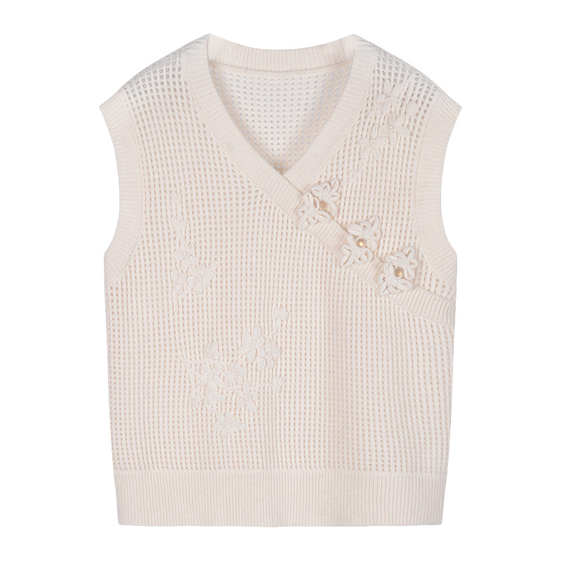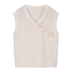 盘扣v领提花镂空无袖 中式 外搭套头针织毛衣背心 新款 固执秋季