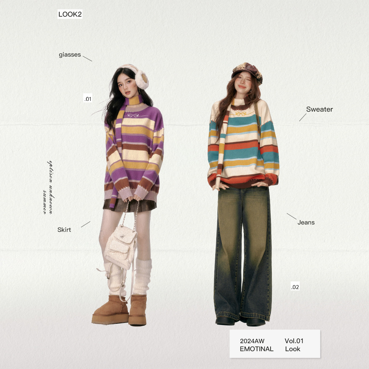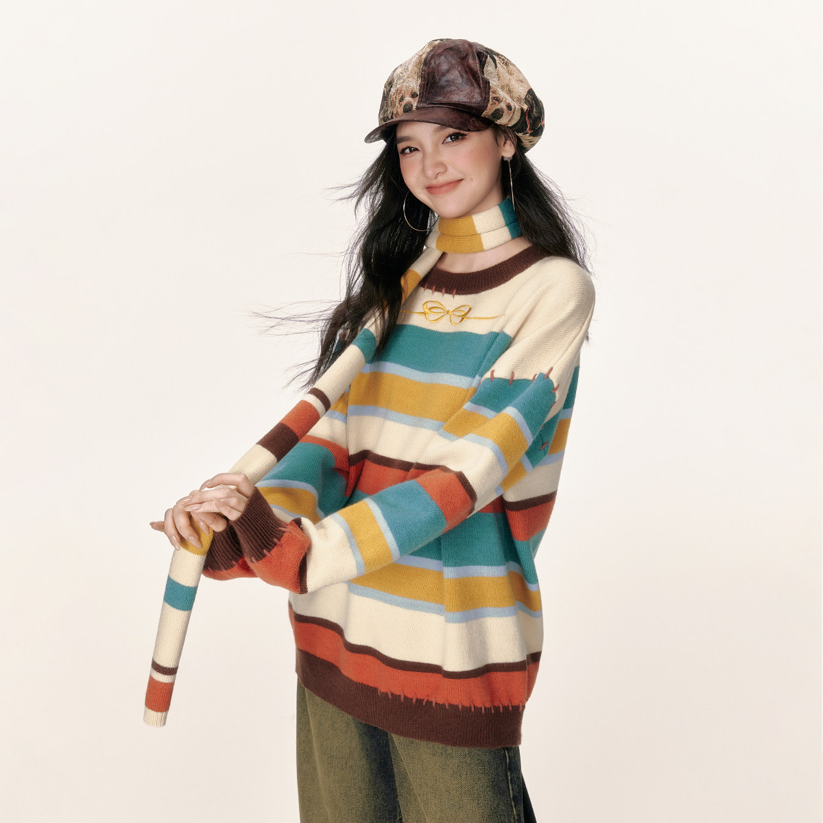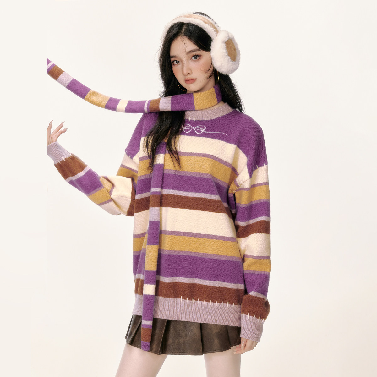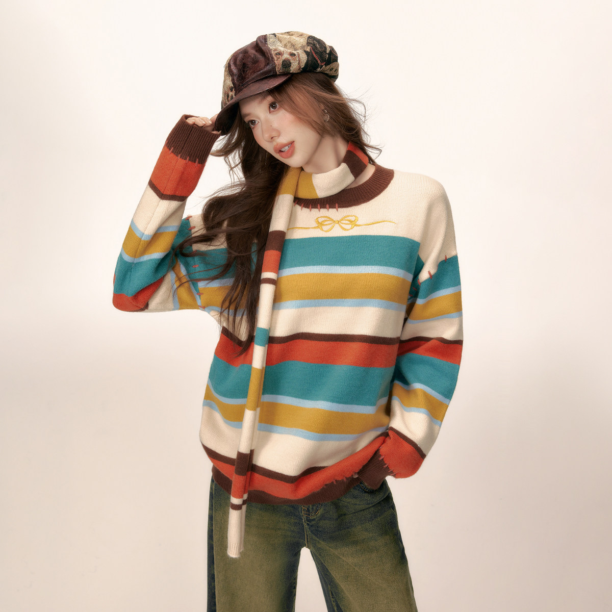 新款 EPTISON条纹带围巾毛衣女2025冬季 件 复古慵懒条纹上衣