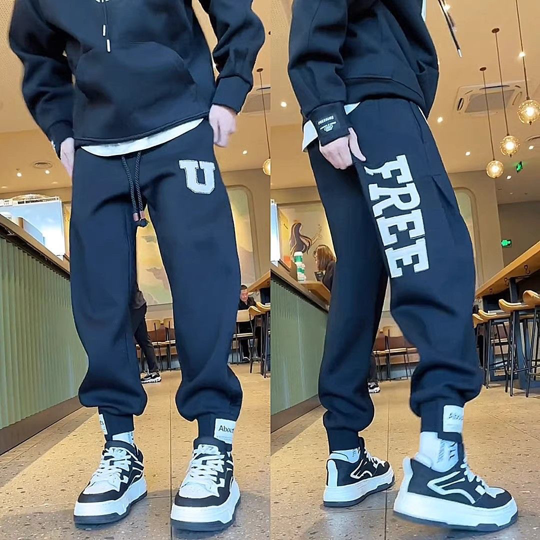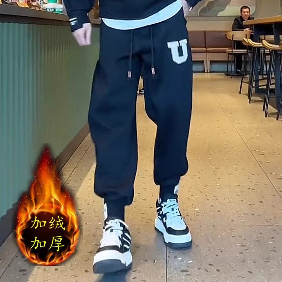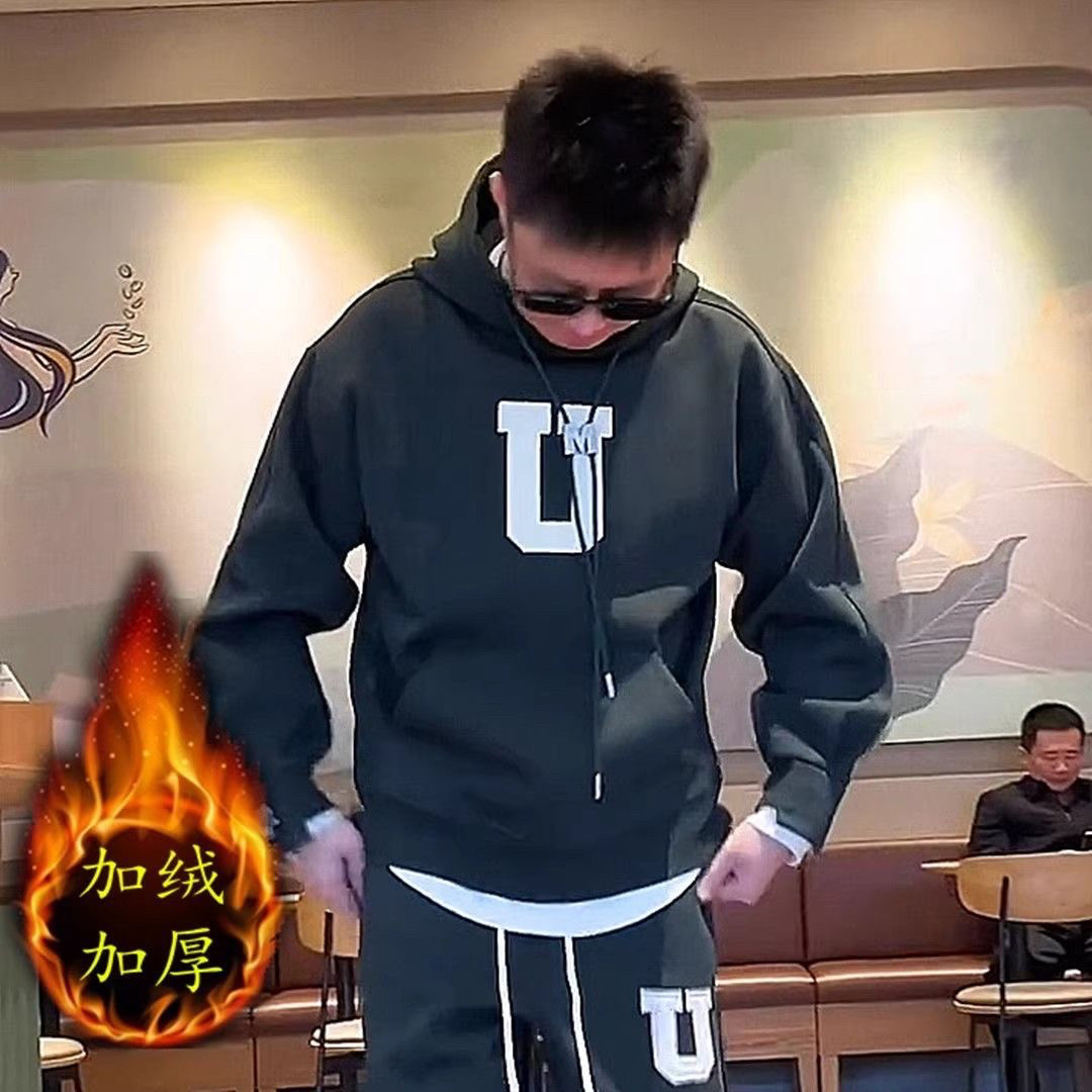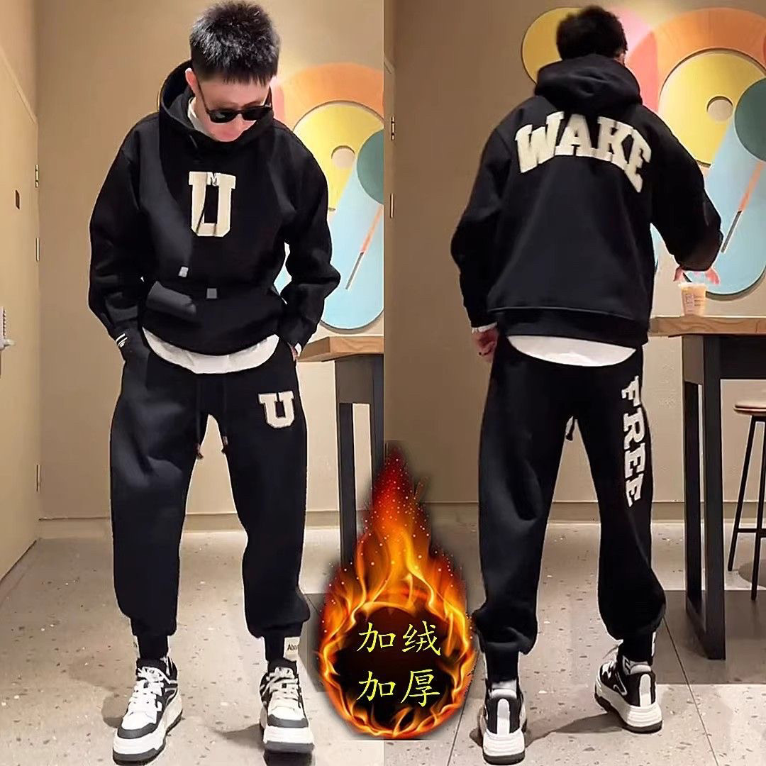 秋冬加绒字母刺绣连帽卫衣卫裤 男休闲百搭运动宽松两件套 休闲套装