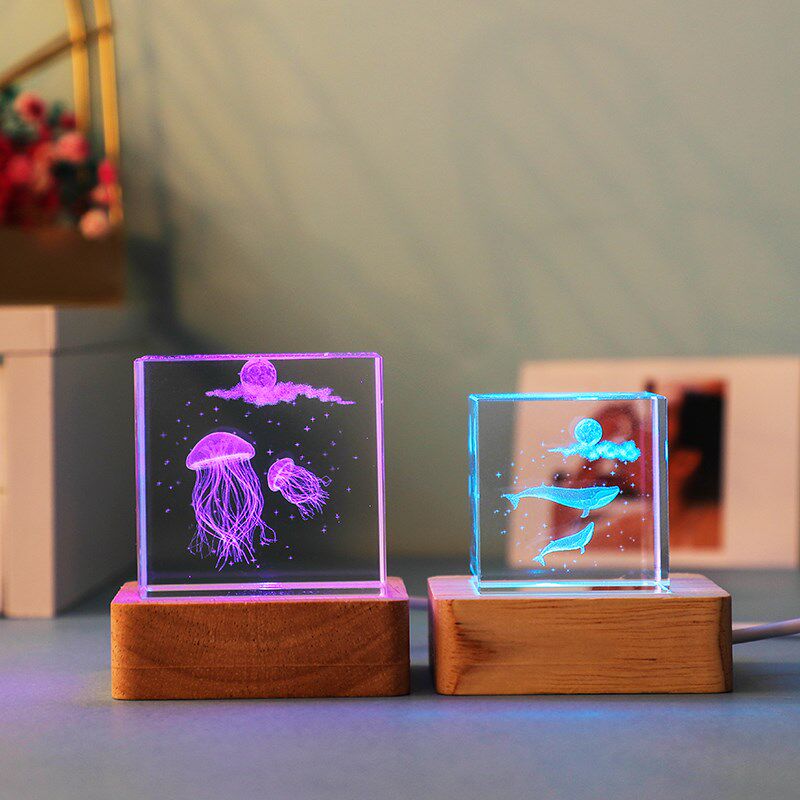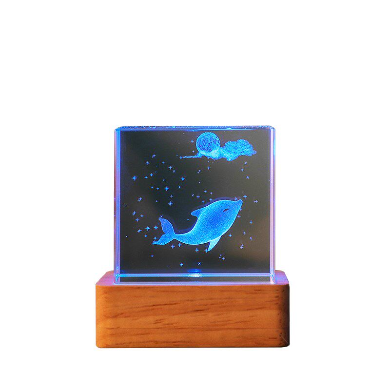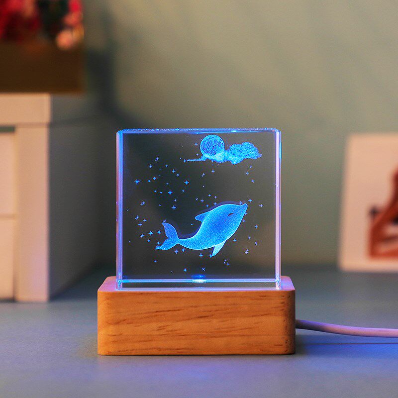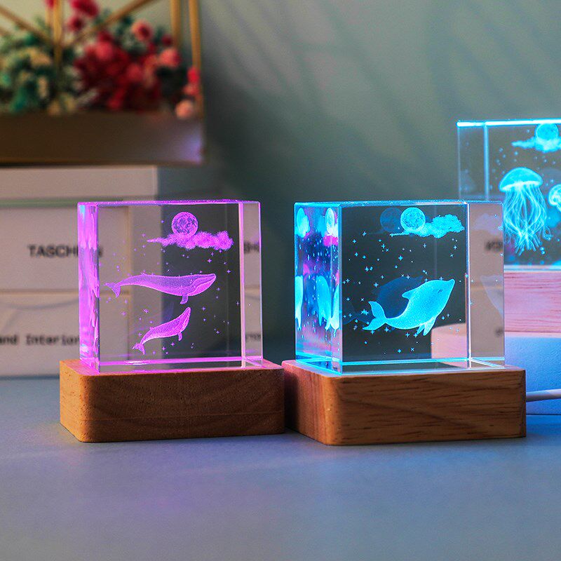 七彩发光方体水晶桌面小摆件海洋生物书桌装 饰品送人儿童生日礼物