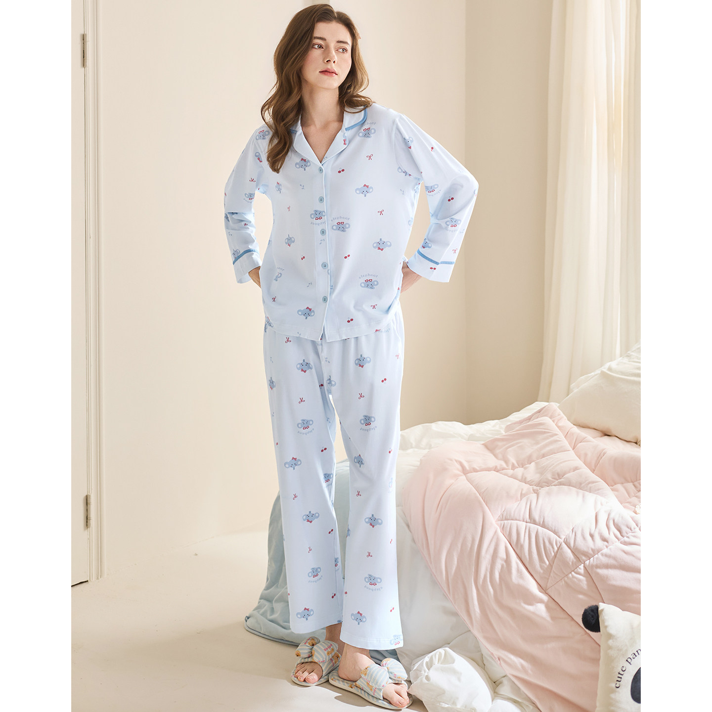 套装 翻领长袖 卡通休闲宽松舒适家居服 新款 芬腾女士纯棉睡衣春秋季