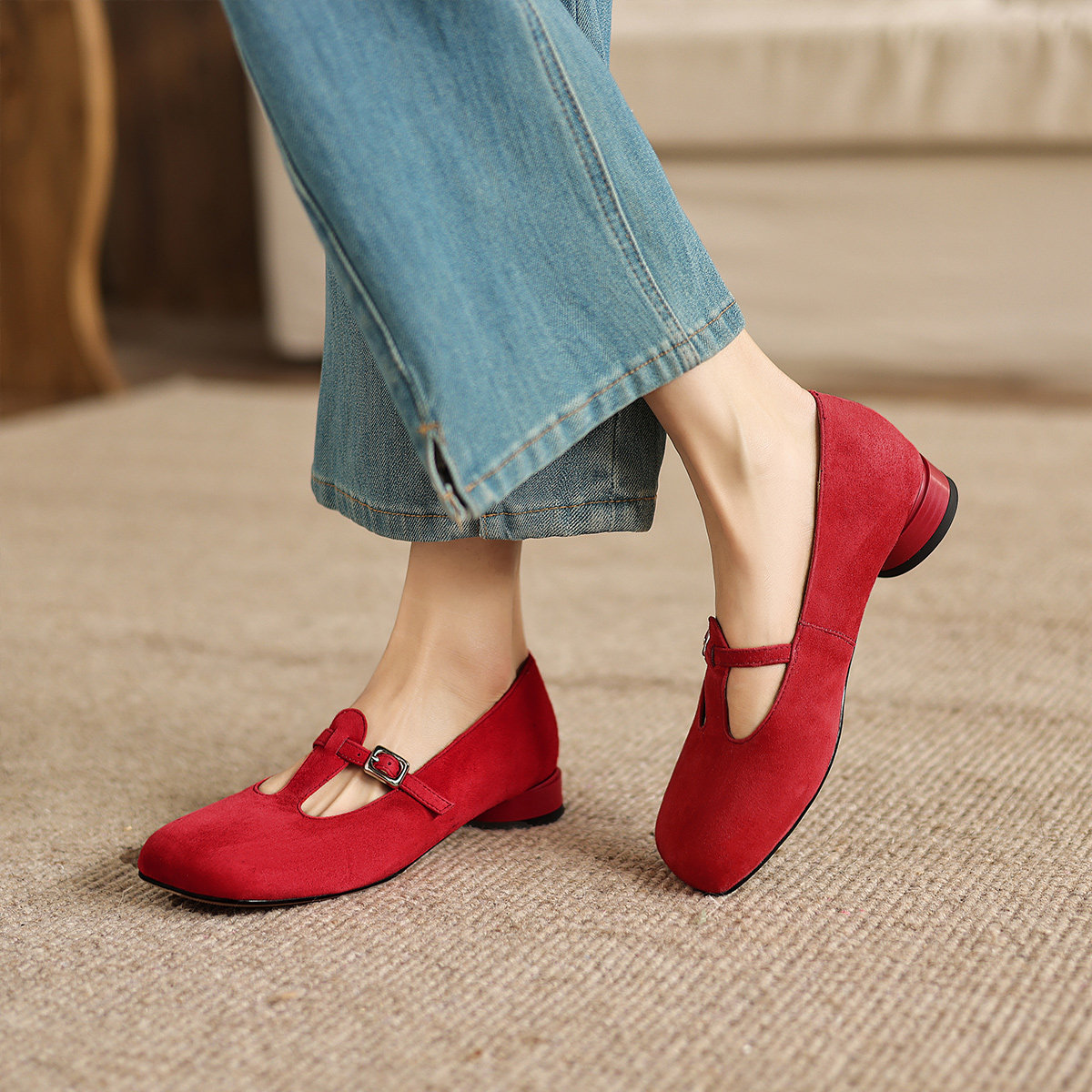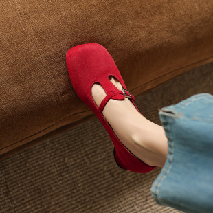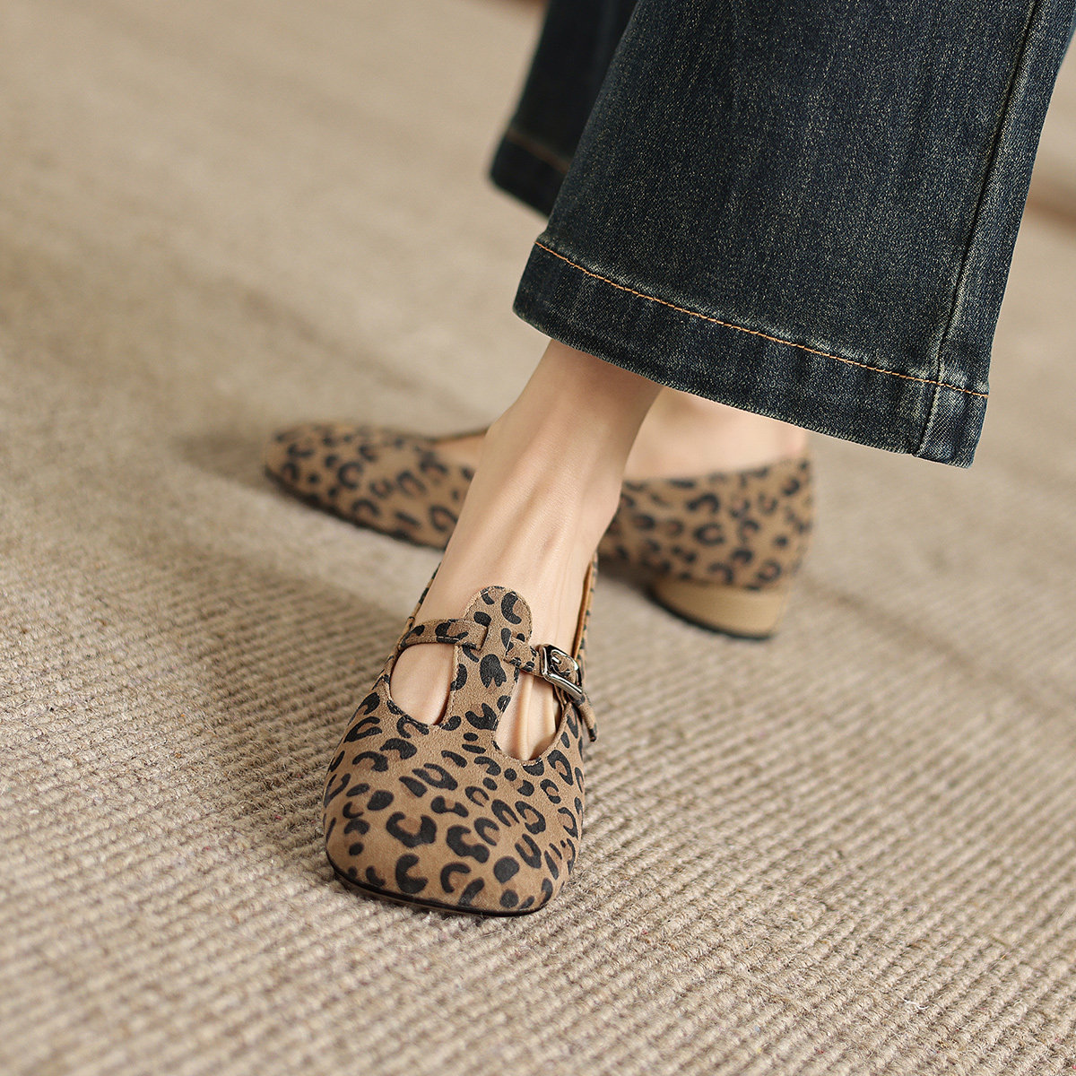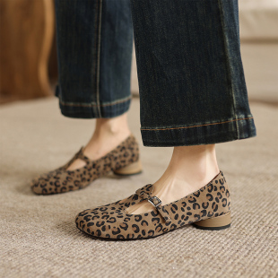 小众豹纹浅口单鞋 阿么手工女鞋 粗跟法式 T字带红色玛丽珍鞋 2CM 新款