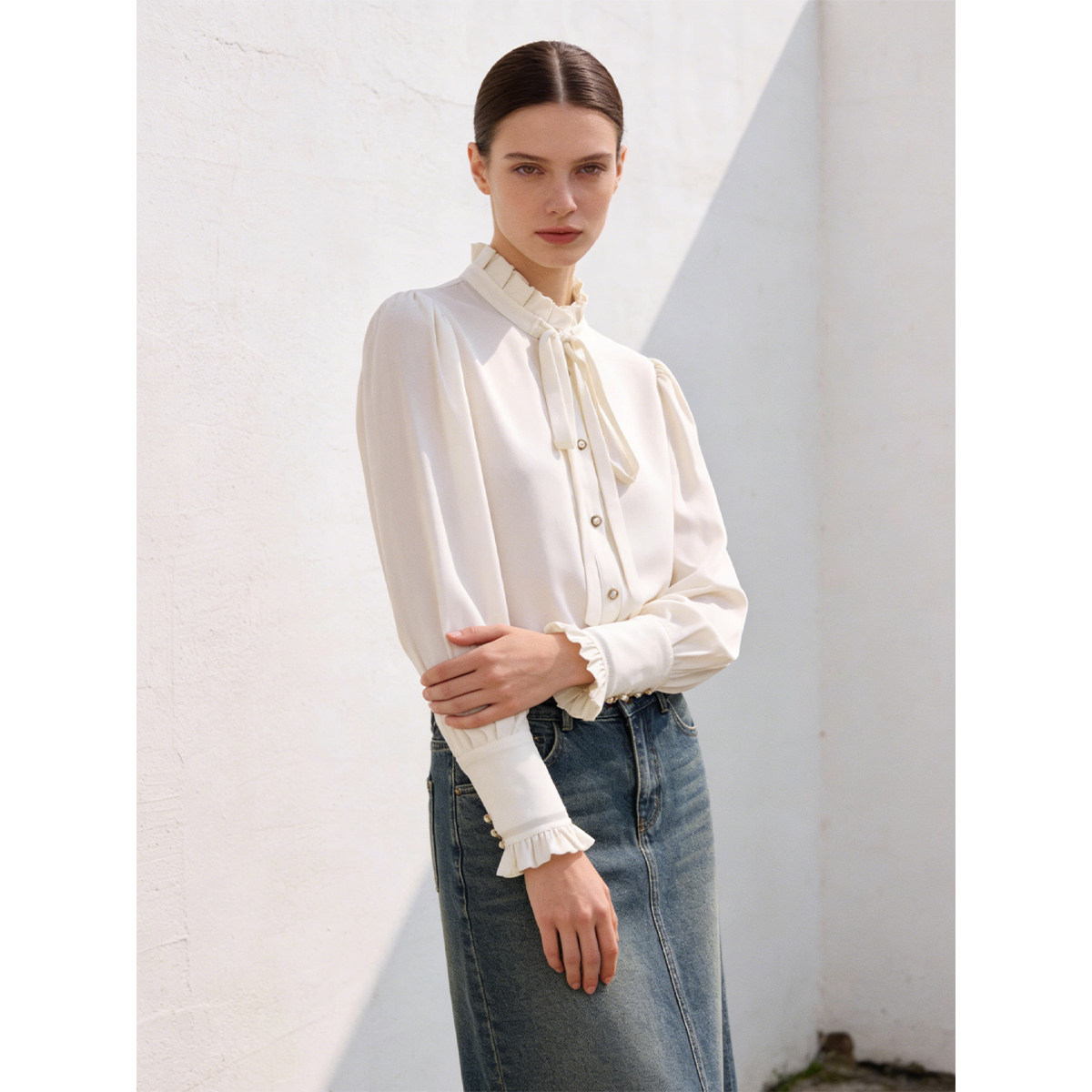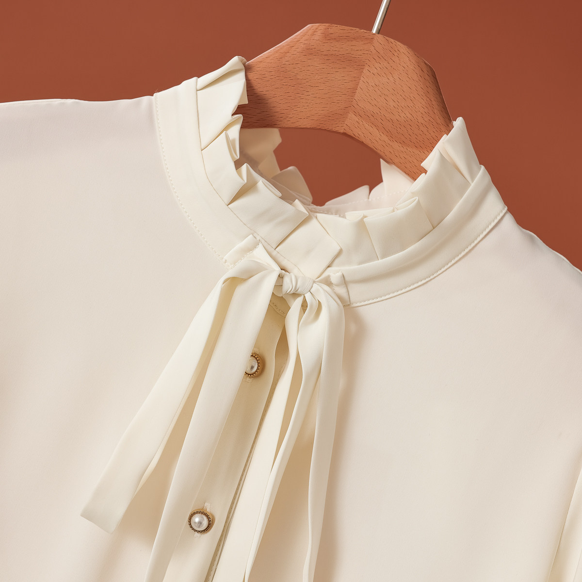 气质木耳边立领单排珍珠扣纯色衬衫 春装 808 奕 669西湖阁老
