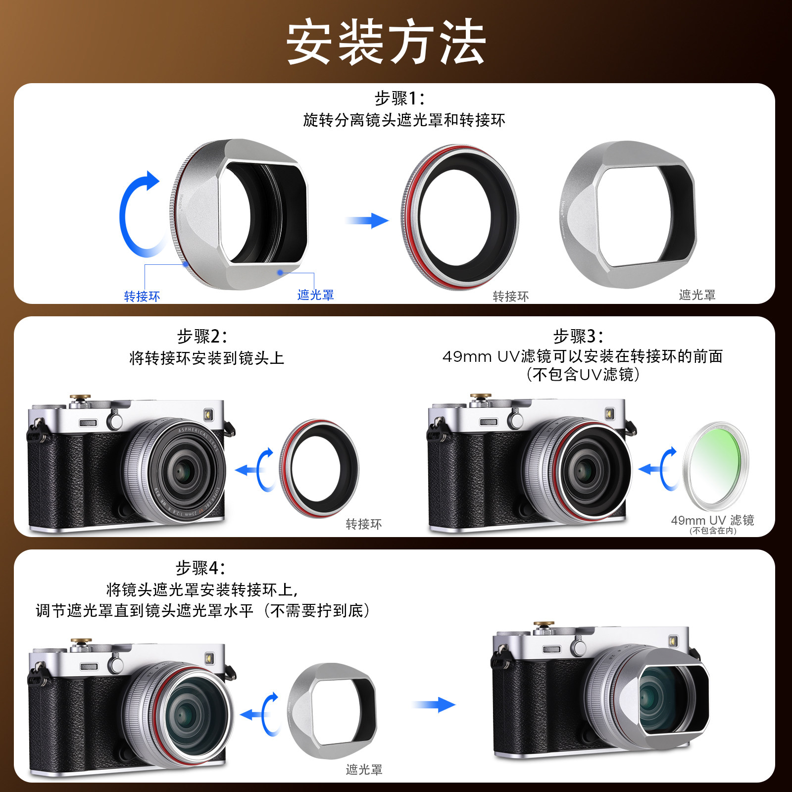 XE5新款 号歌39mm用于富士XF23mm F2.8 WR镜头复古配件带盖 f2.8镜头方形金属遮光罩XE5套机镜头XF27mm