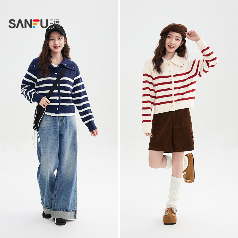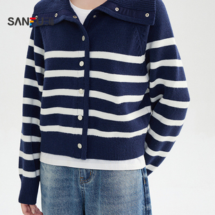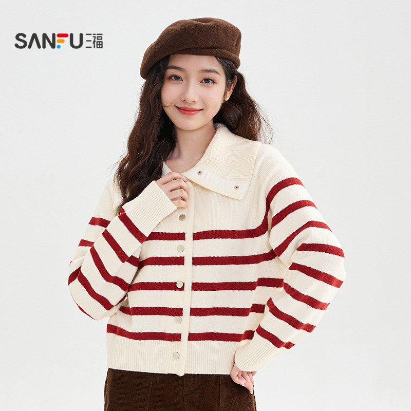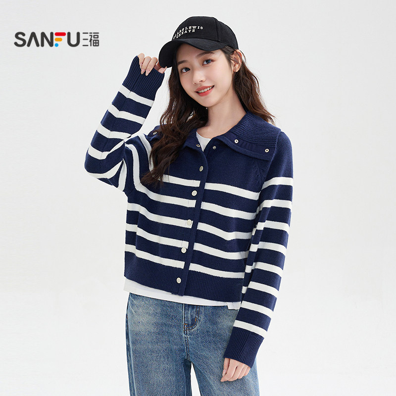 休闲宽松大翻领条纹外套上衣女装 冬季 512192 毛衣2025新款 三福开衫