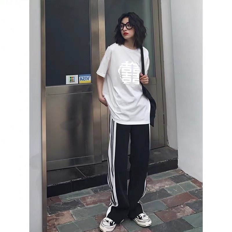 休闲侧条纹直筒外穿长裤 2021春夏韩版 夏 子宽松运动k阔腿裤 孕妇裤