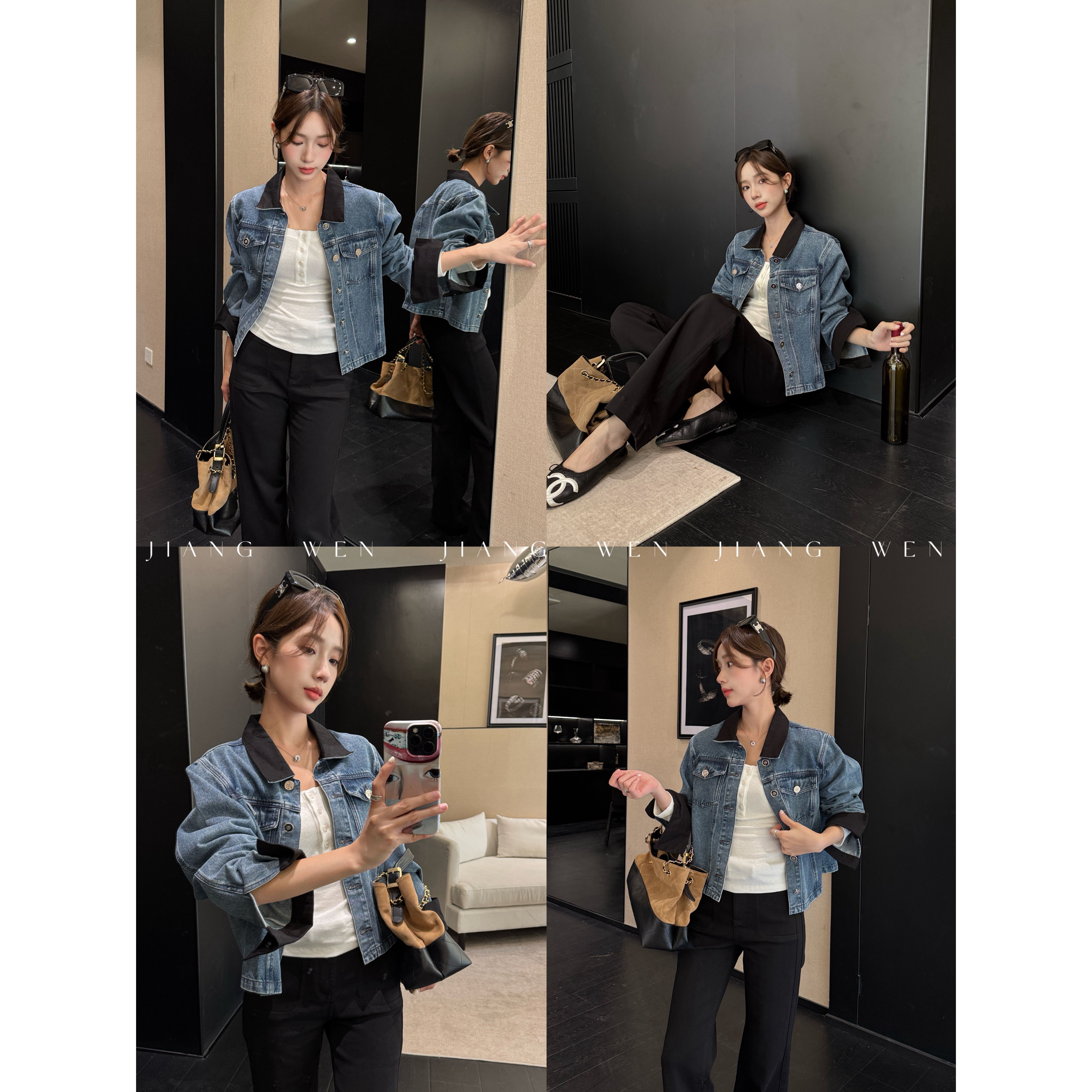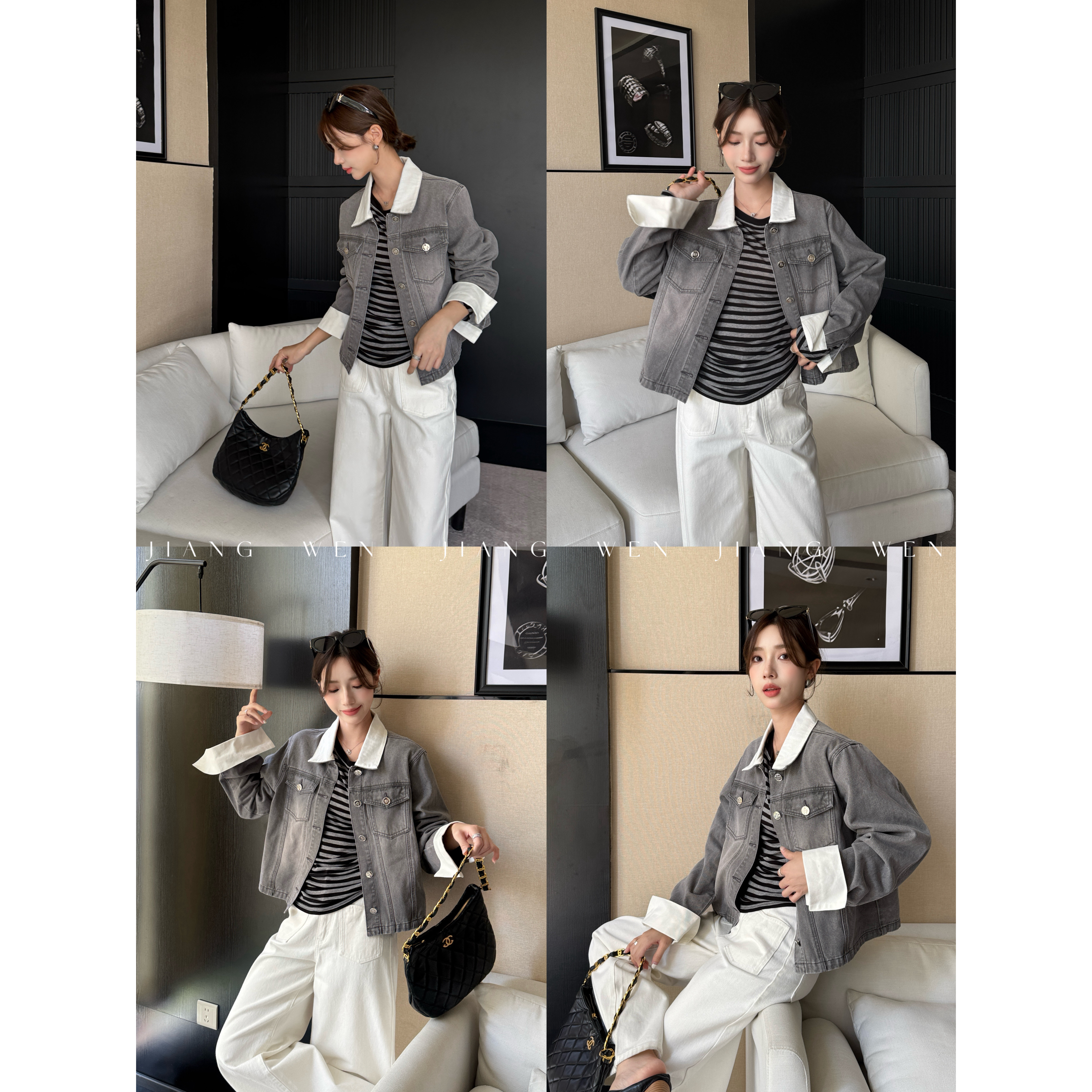 水洗复古春秋 短款 姜雯灰色牛仔外套女2025新款 拼接翻领夹克长袖