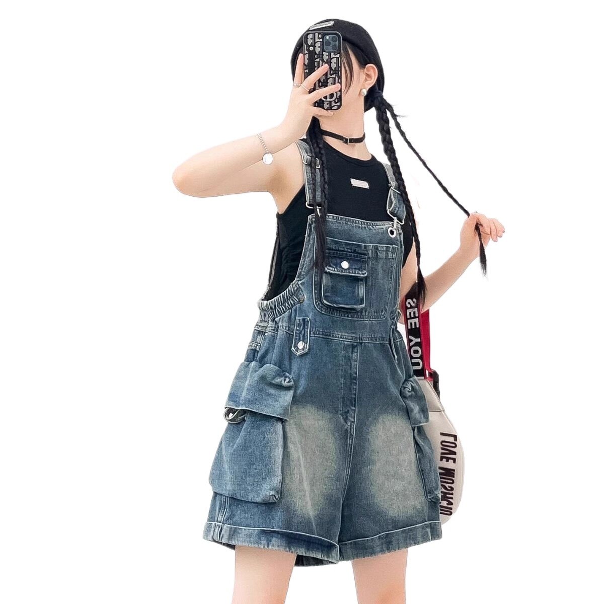 设计感高腰宽松显瘦阔腿连体短裤 新款 子 夏季 复古百搭牛仔背带短裤