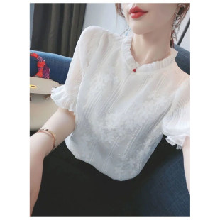 上衣女人味小衫 白衬衫 女长袖 上衣荷叶边领2025春秋打底衫 潮 春季
