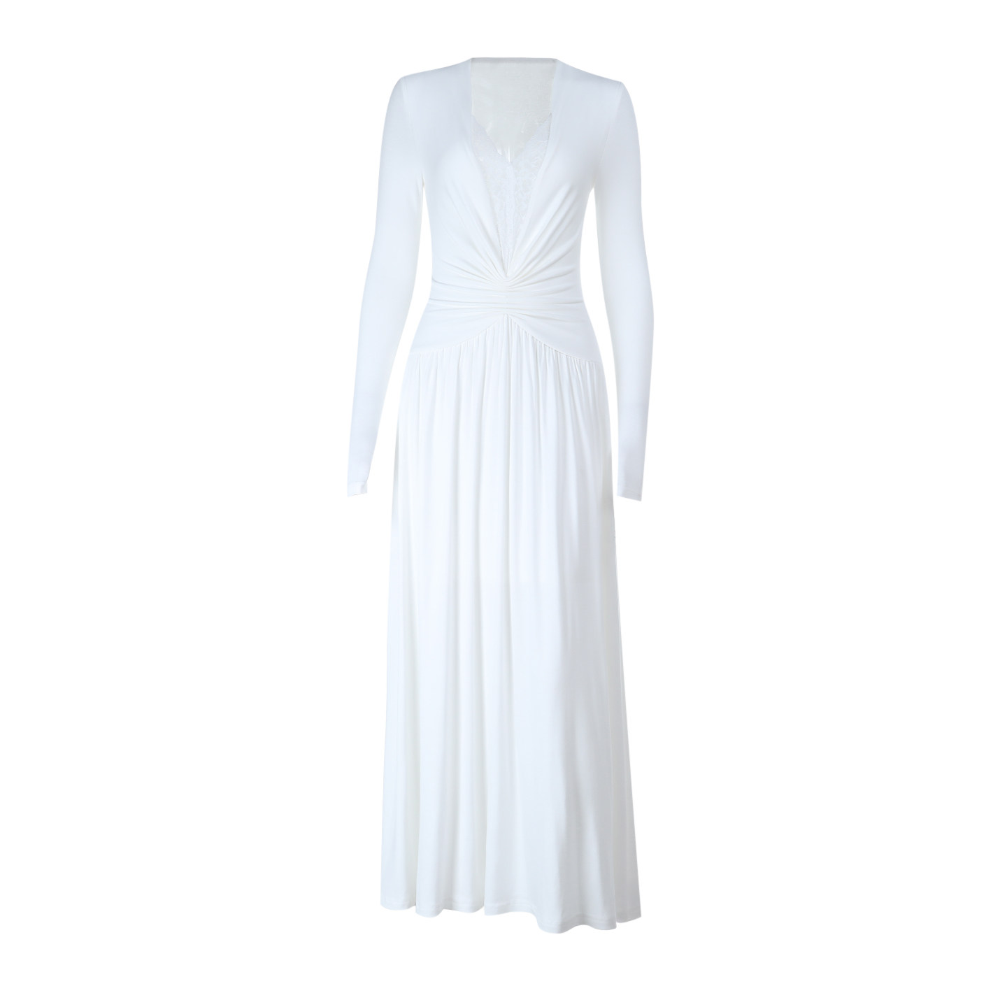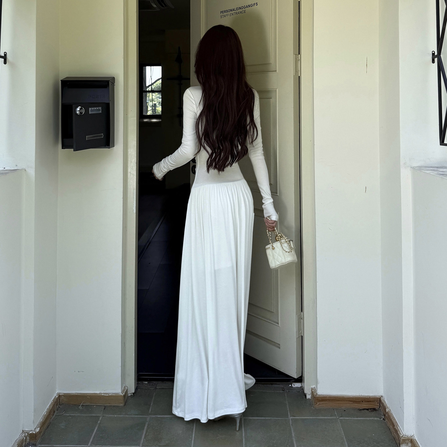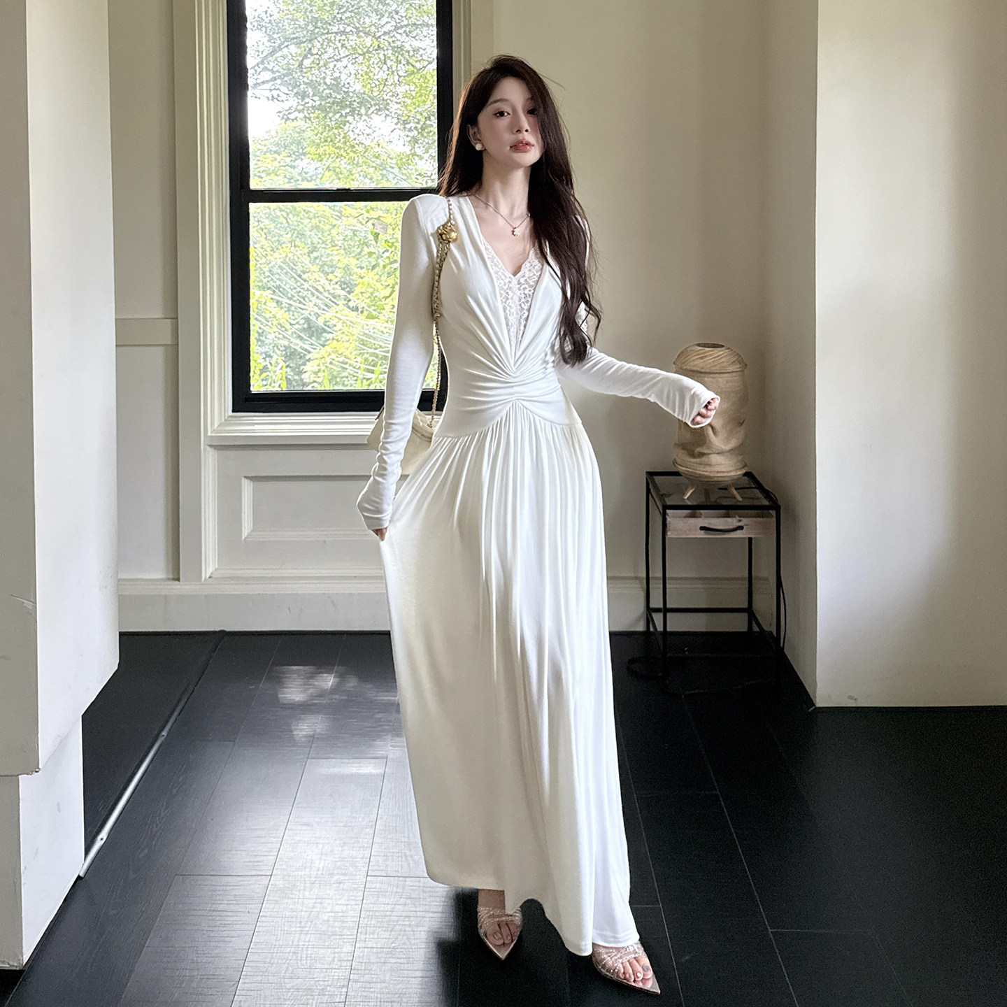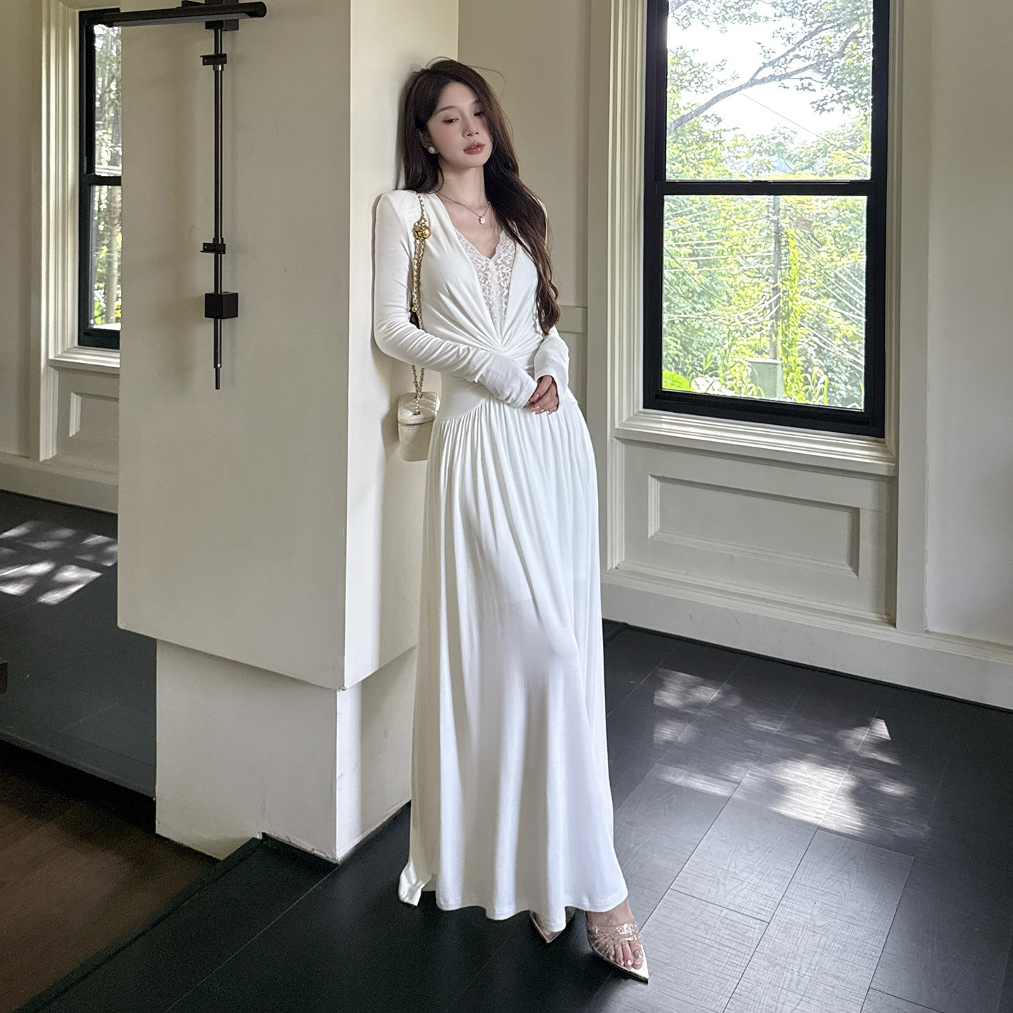 气质长袖 新款 晚礼服裙 蕾丝拼接V领白色连衣裙女2025秋季 instahot