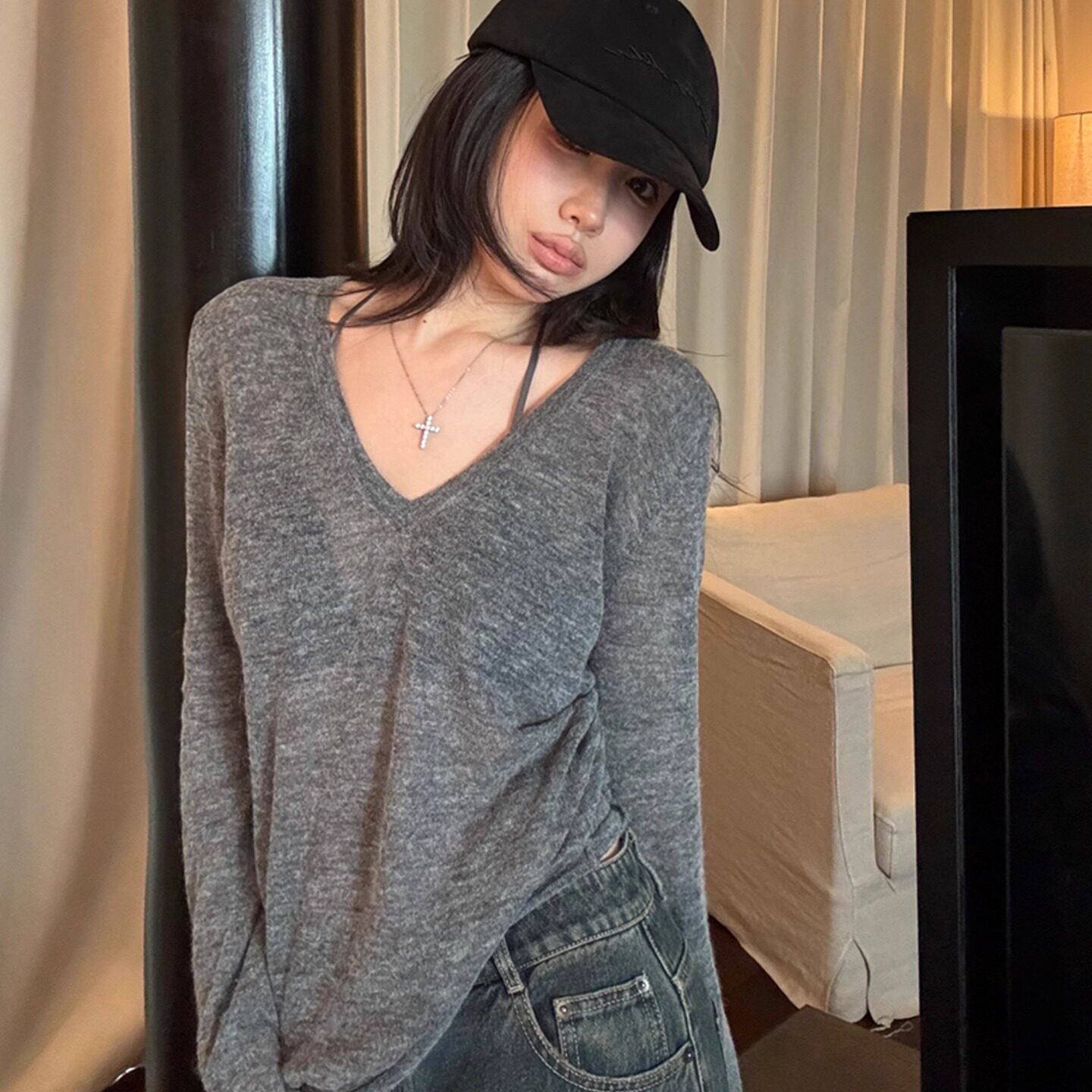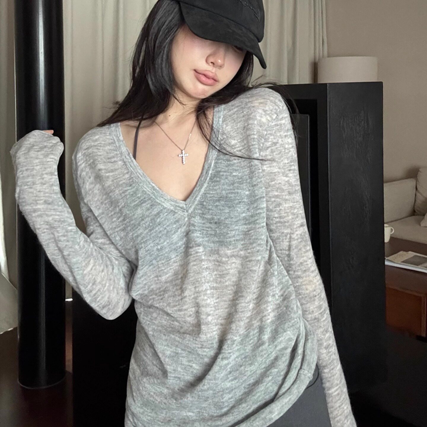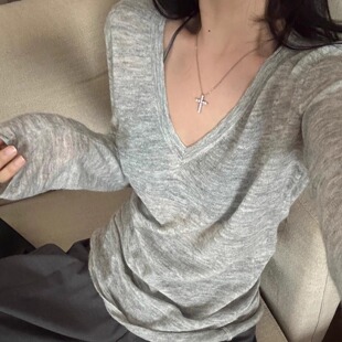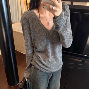 上衣薄 内搭打底罩衫 松弛感灰色v领针织衫 女秋冬老钱风大领口修身