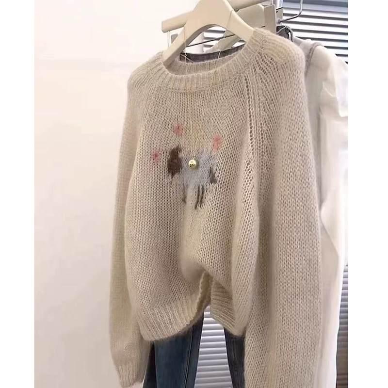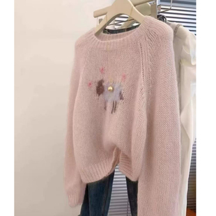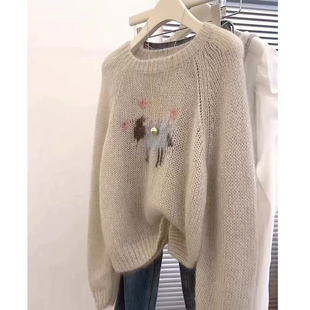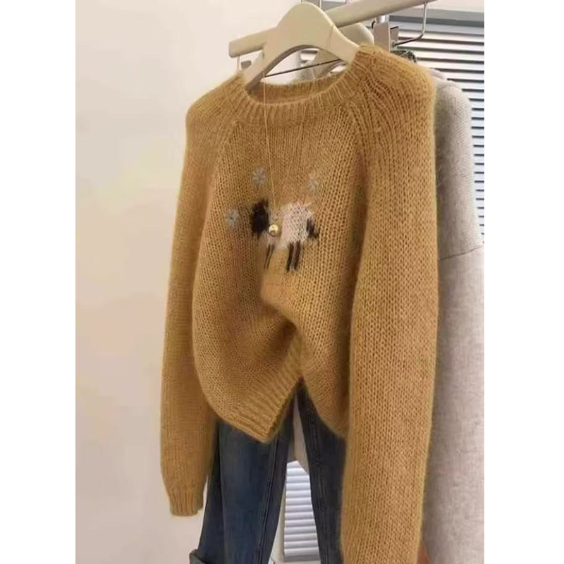 宽松套头针织衫 女圆领小羊刺绣长袖 毛衣秋冬上衣 可爱风羊绒衫 韩式