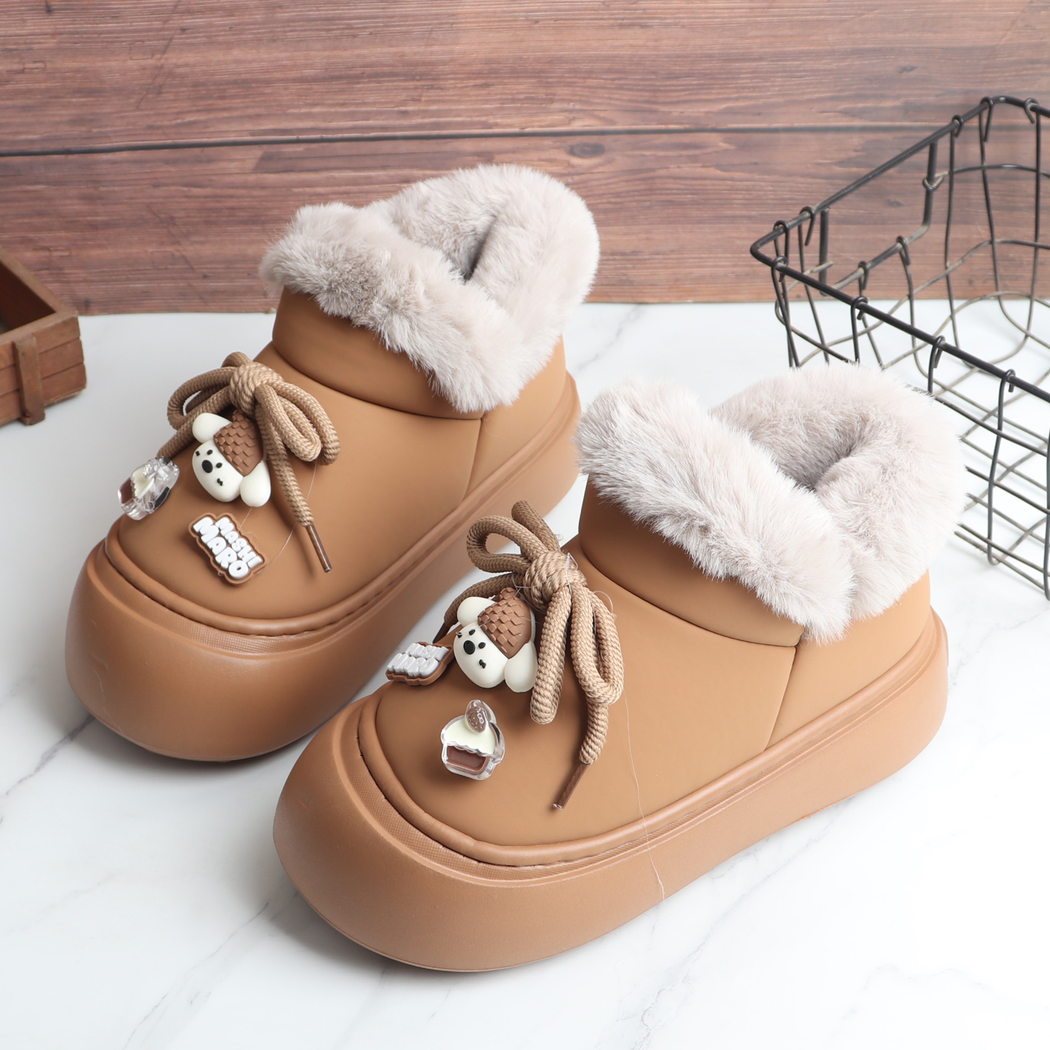 冬季 女潮流卡通绑带防滑加绒PU面棉靴 加厚保暖学院风外穿包跟棉鞋
