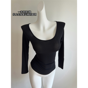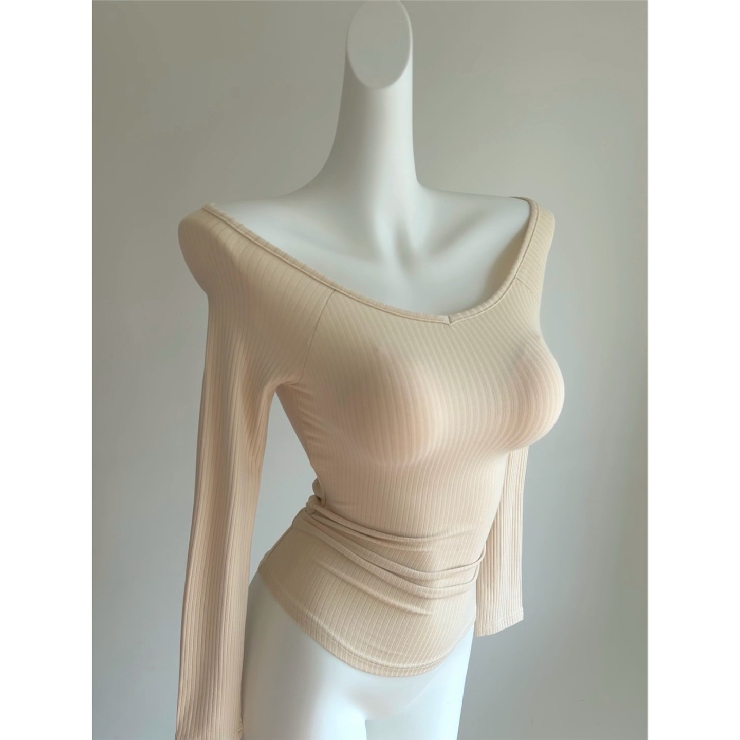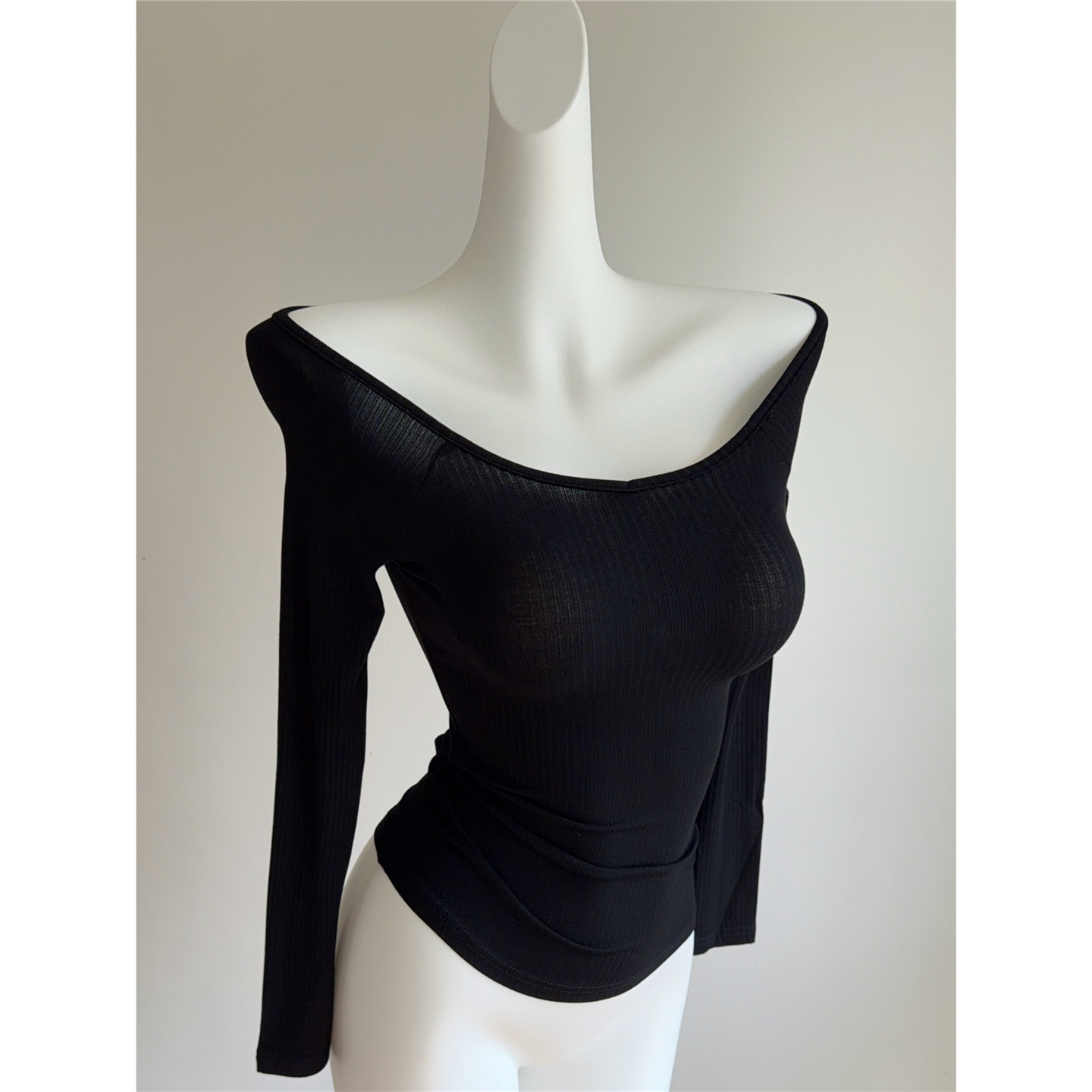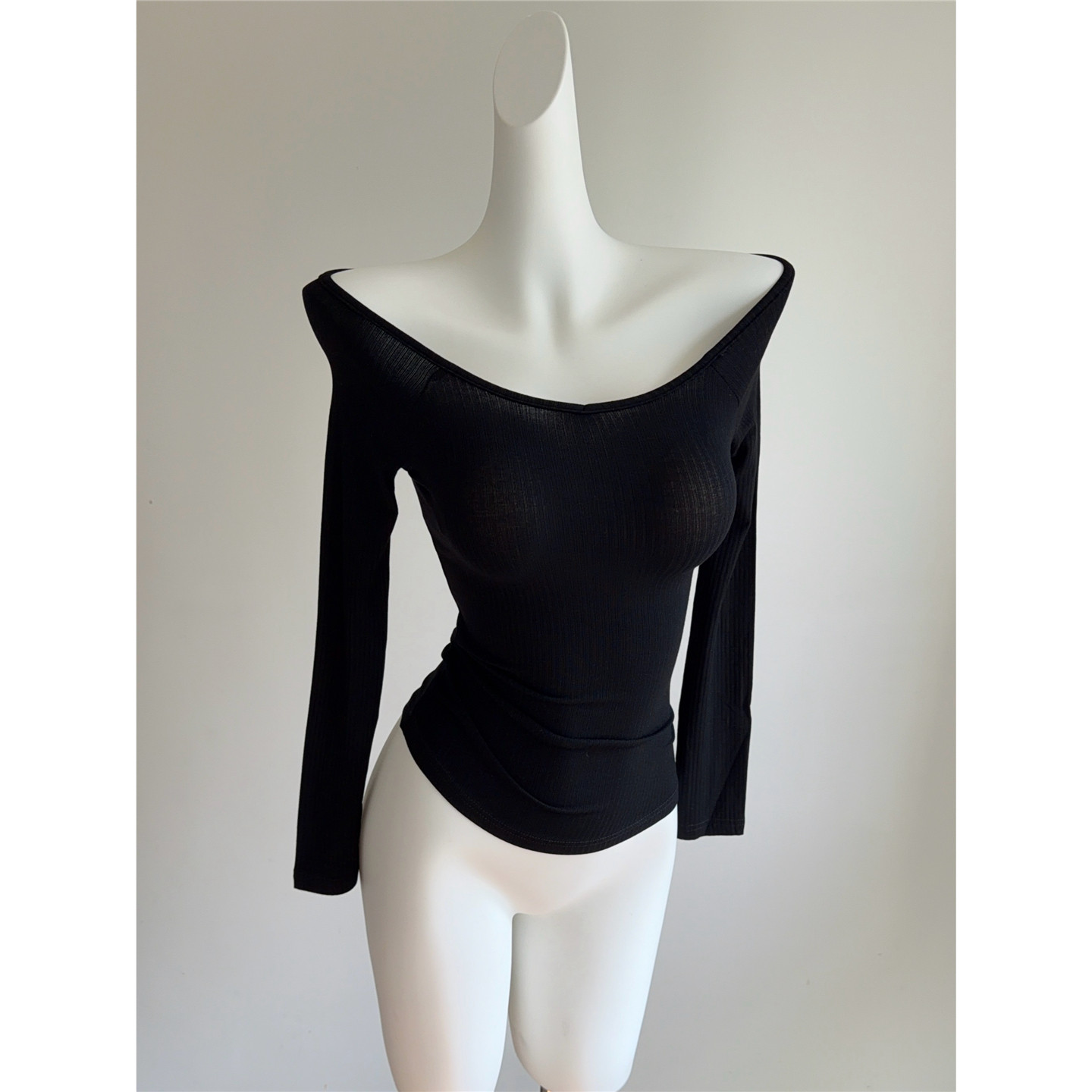 一字肩上衣 长袖 斜肩打底衫 V领修身 女 进口面料 T恤 自留两色