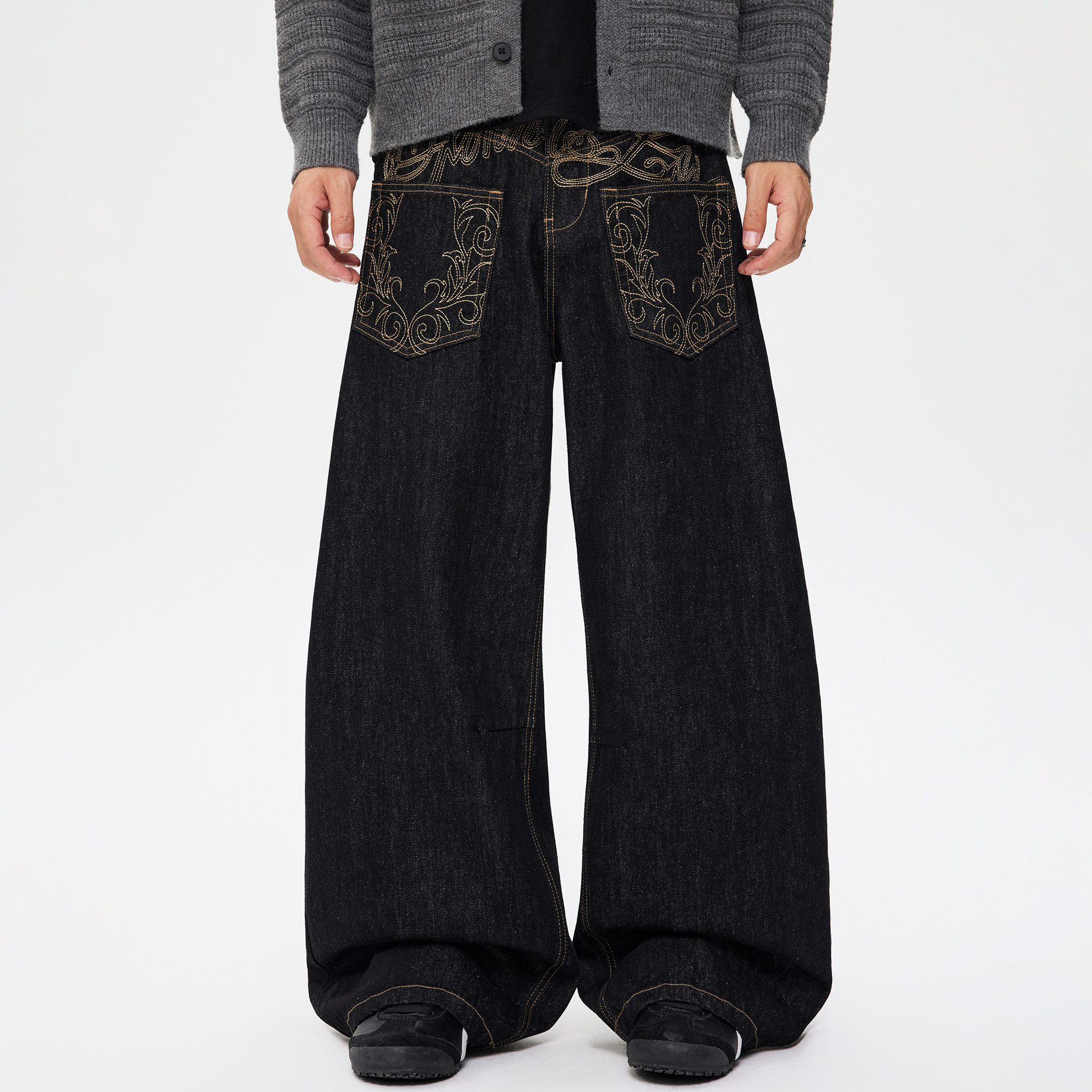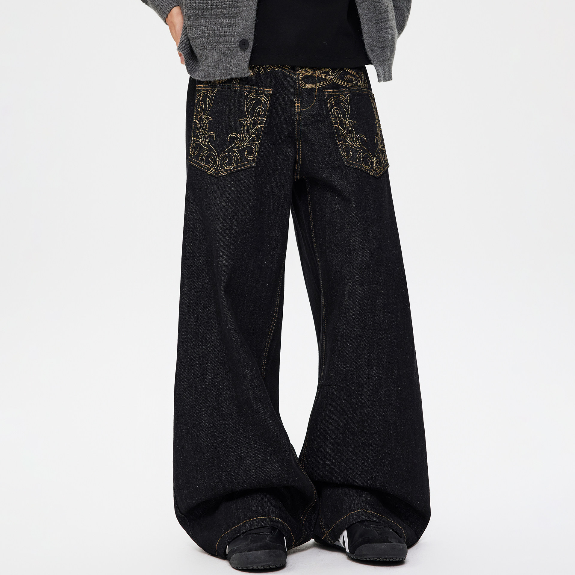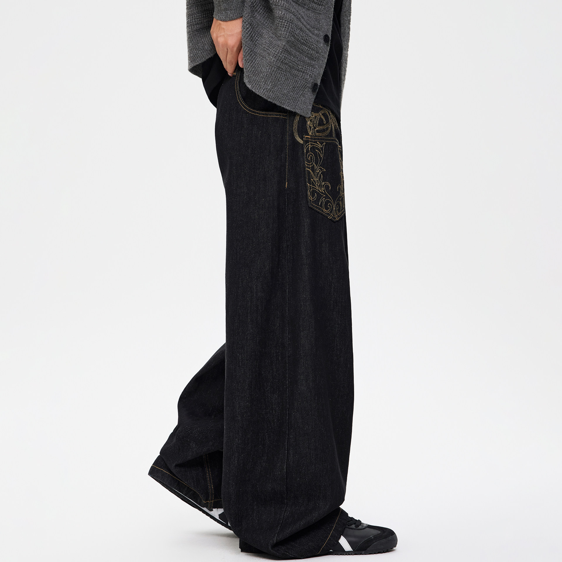 秋冬季 阔腿拖地长裤 美式 男款 子 刺绣印花复古宽松牛仔裤 JFU潮牌