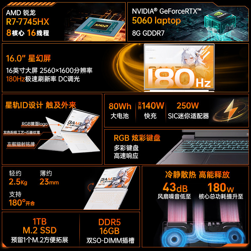 RTX5060独显2.5K 机械师曙光16S 7745HX 锐龙R7 180Hz高刷屏电竞办公大学生家用笔记本游戏本电脑187 星釉白