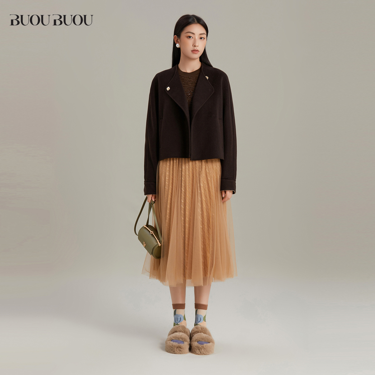 HM女装 立领宽松毛茸宽松附侧唇袋短大衣1248383 毛呢外套冬季