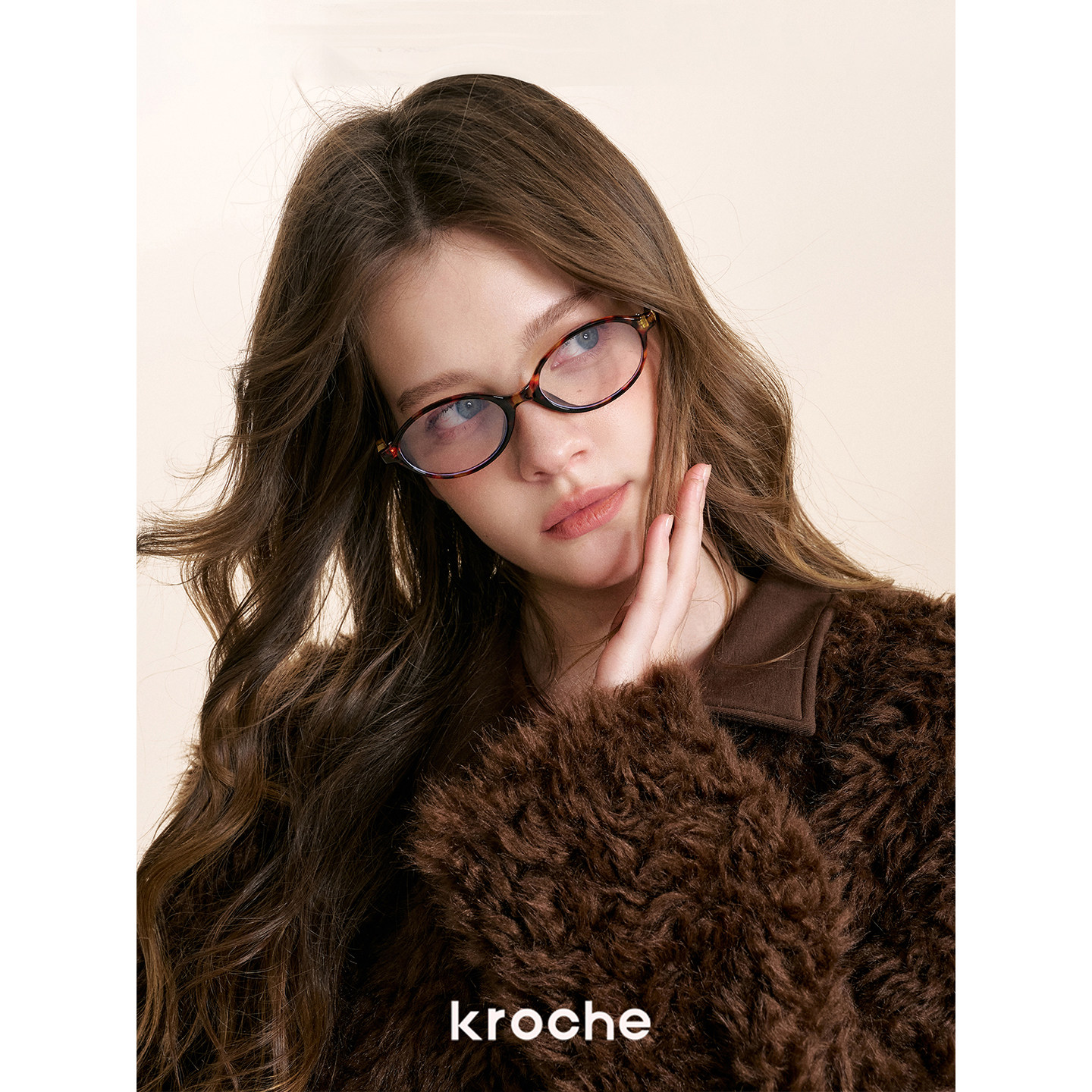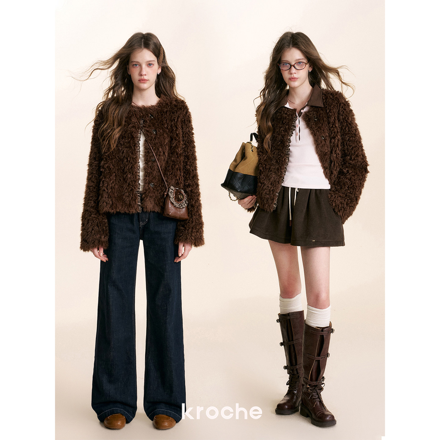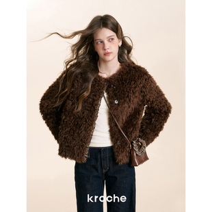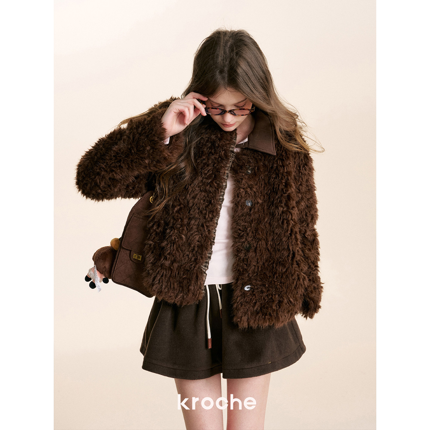 格纹花边拼接皮毛一体圆领宽松羊羔毛外套 焦糖绒冬 Kroche 25aw