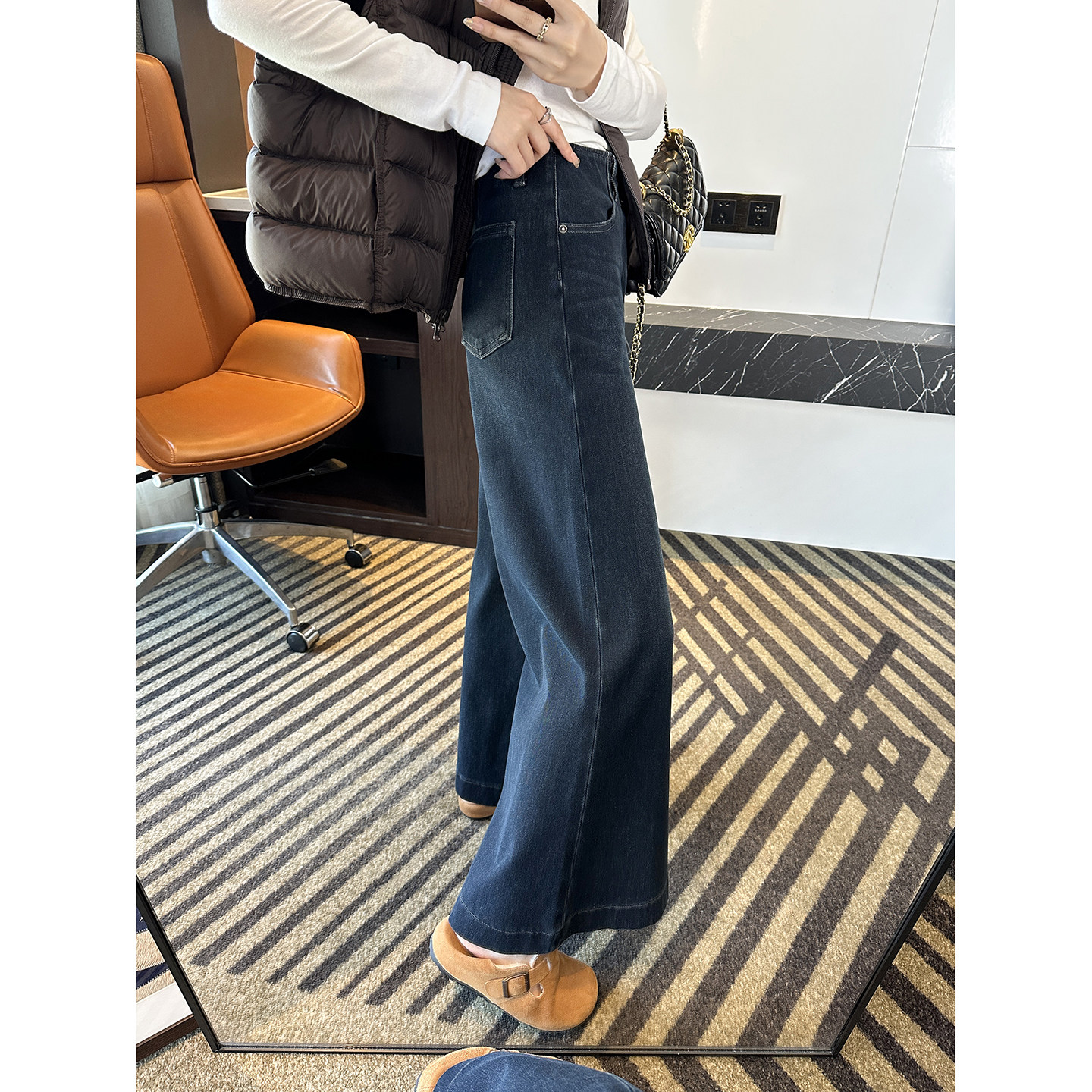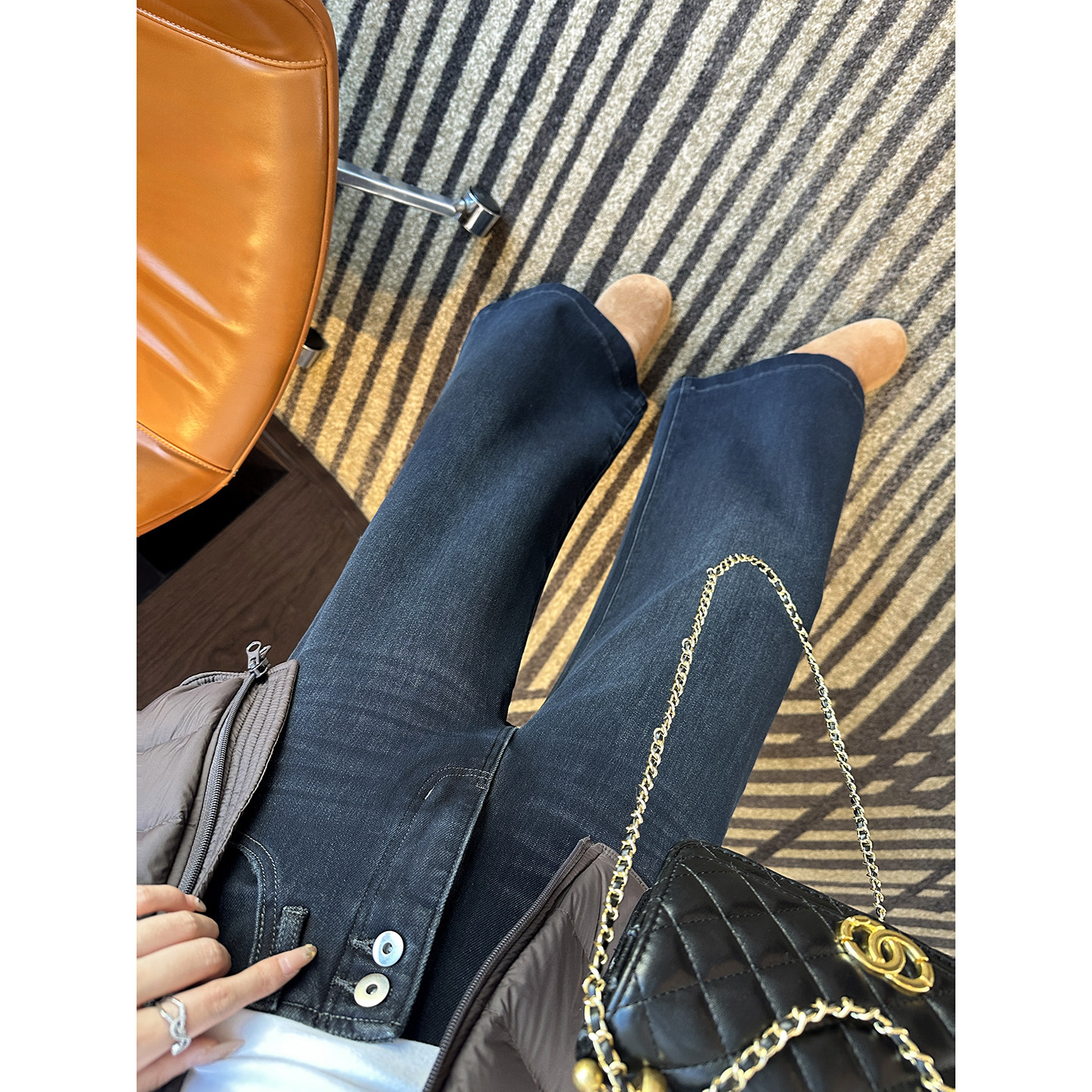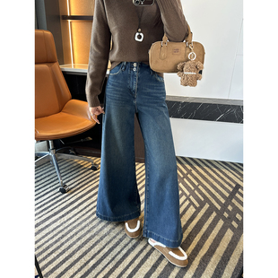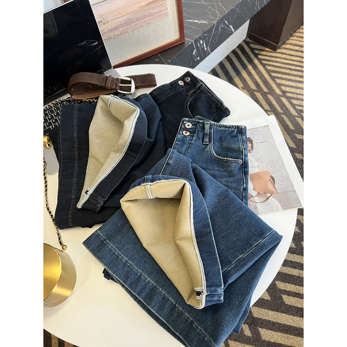 保暖加绒宽松阔腿牛仔裤 女秋冬新款 高腰双粒扣筒喇叭裤 比例神裤