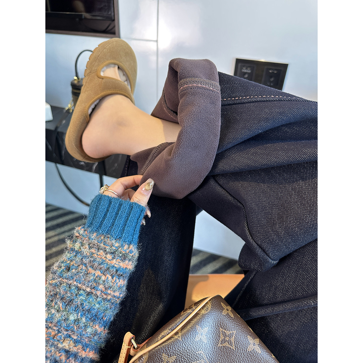 秋冬拖地长裤 宽松直筒阔腿裤 女冬季 水貂绒高腰显瘦加厚加绒牛仔裤