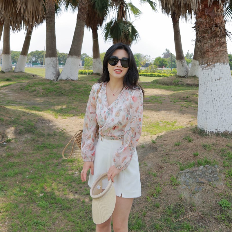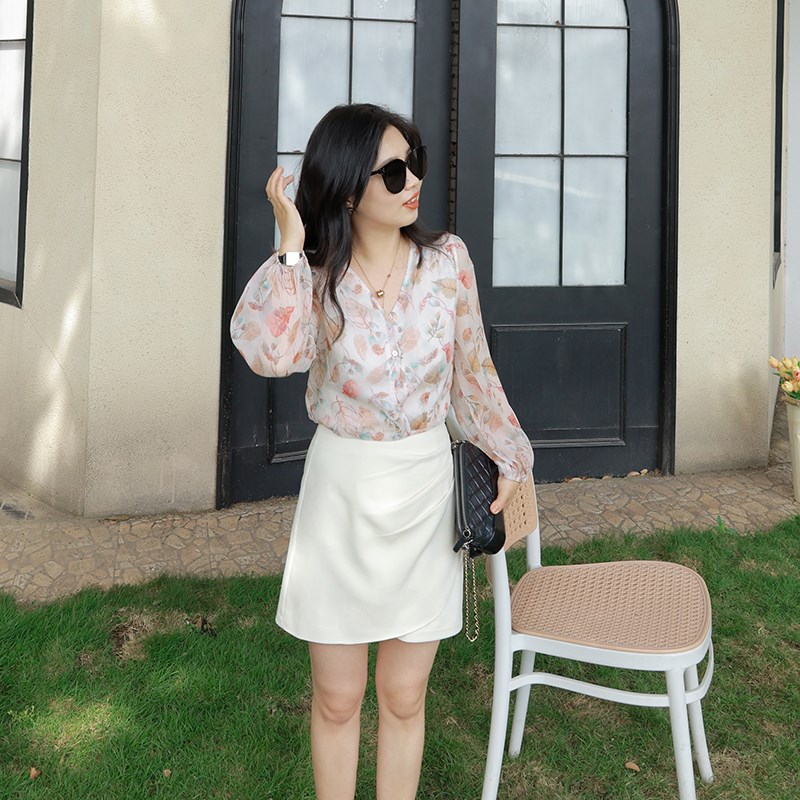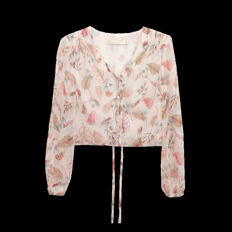 雪纺衫 V领碎花长袖 后背绑带上衣设计感温柔淑女 薄款 小个子法式