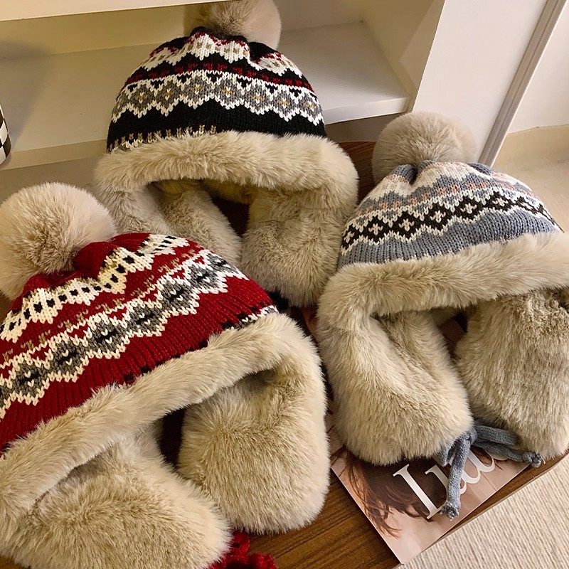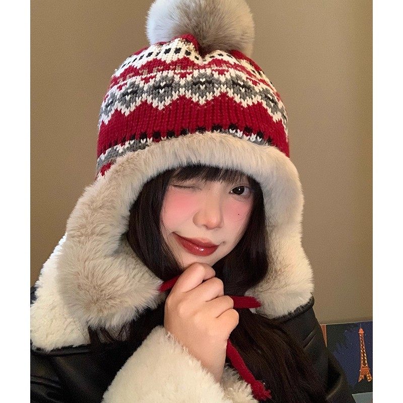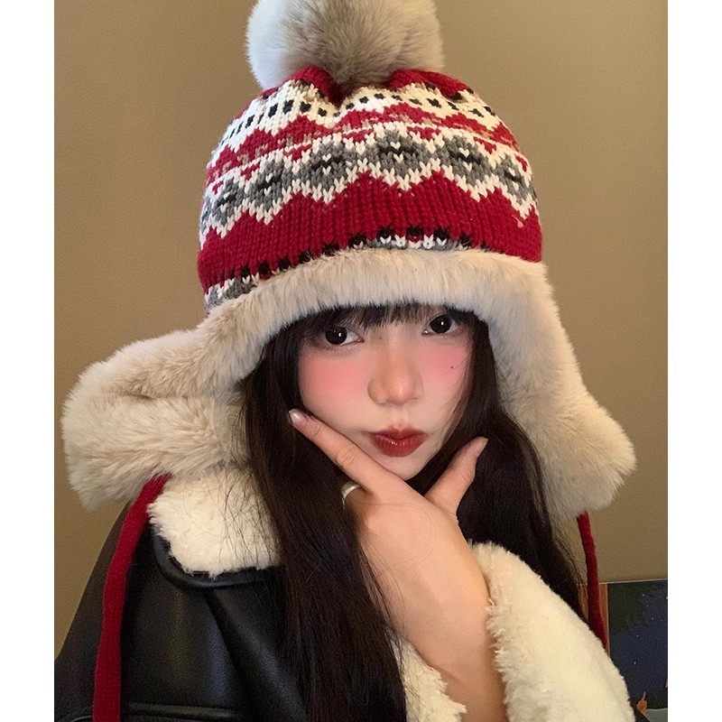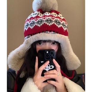 加绒加厚雷锋帽子女秋冬季 保暖护耳民族风针织毛线帽防寒东北骑车