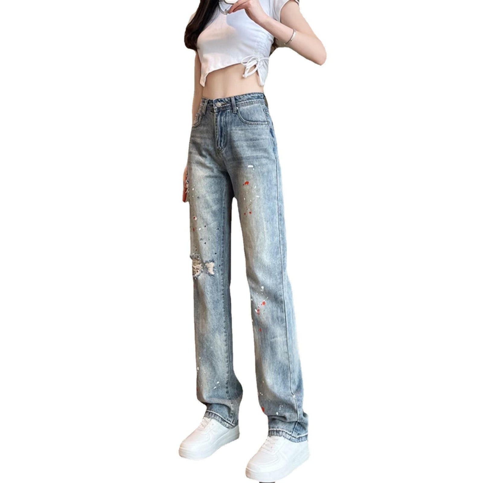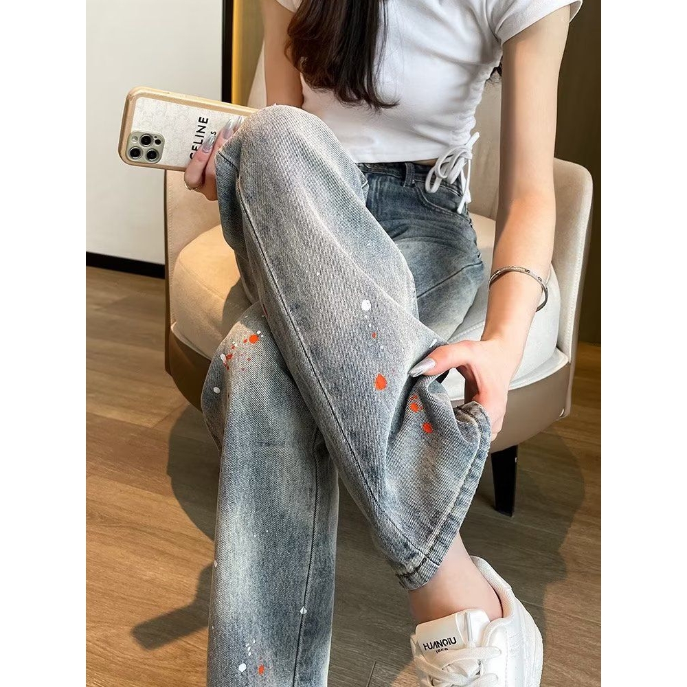 高腰宽松显瘦直筒裤 美式 设计感小个子新款 女秋季 潮 泼墨破洞牛仔裤