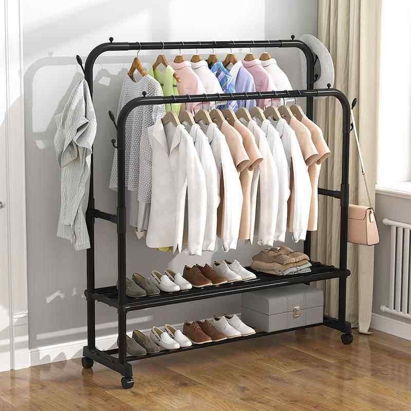 双杆式 衣帽架置地卧室阳台简易晾晒衣架双层挂衣杆升降收纳架带轮
