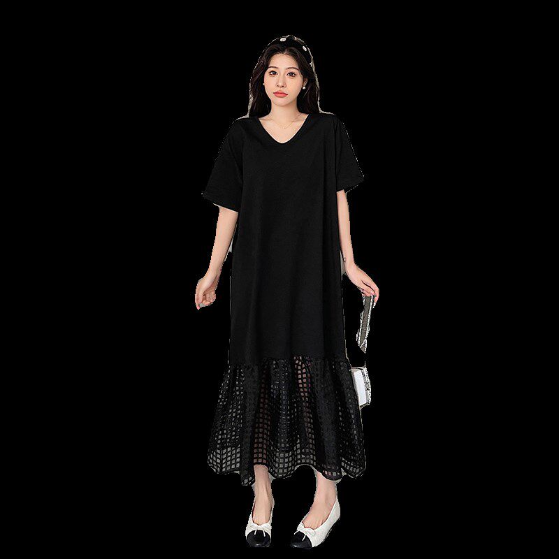 胖mm宽松过膝垂感长款 遮肚子显瘦气质夏装 v领鱼尾连衣裙 女装 大码