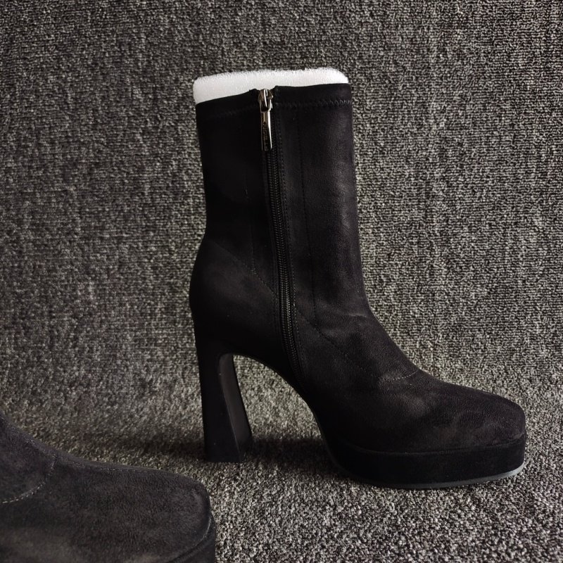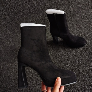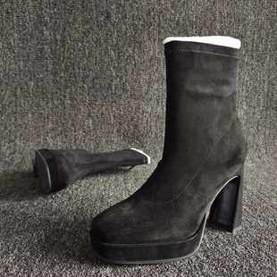 百丽画廊假日加绒时装 弹力靴反绒面粗高跟显瘦瘦短靴子BBWB1DZ5