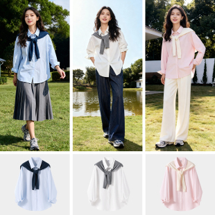韩系学院风时尚 班尼路披肩POLO领长袖 春夏新款 女款 减龄衬衣Q 衬衫
