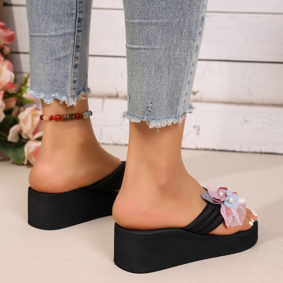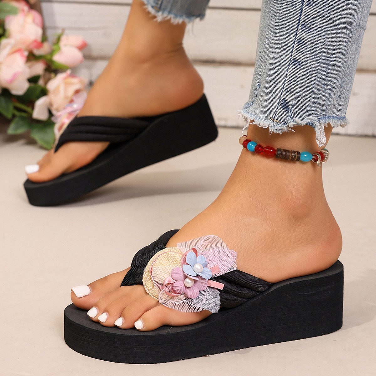 女款 增高坡跟外穿海边沙滩仙女凉拖鞋 新款 厚底人字拖女士夏季