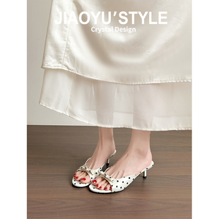 气质尖头细跟露趾凉鞋 女夏外穿2026新款 骄屿波点一字凉拖鞋 真皮