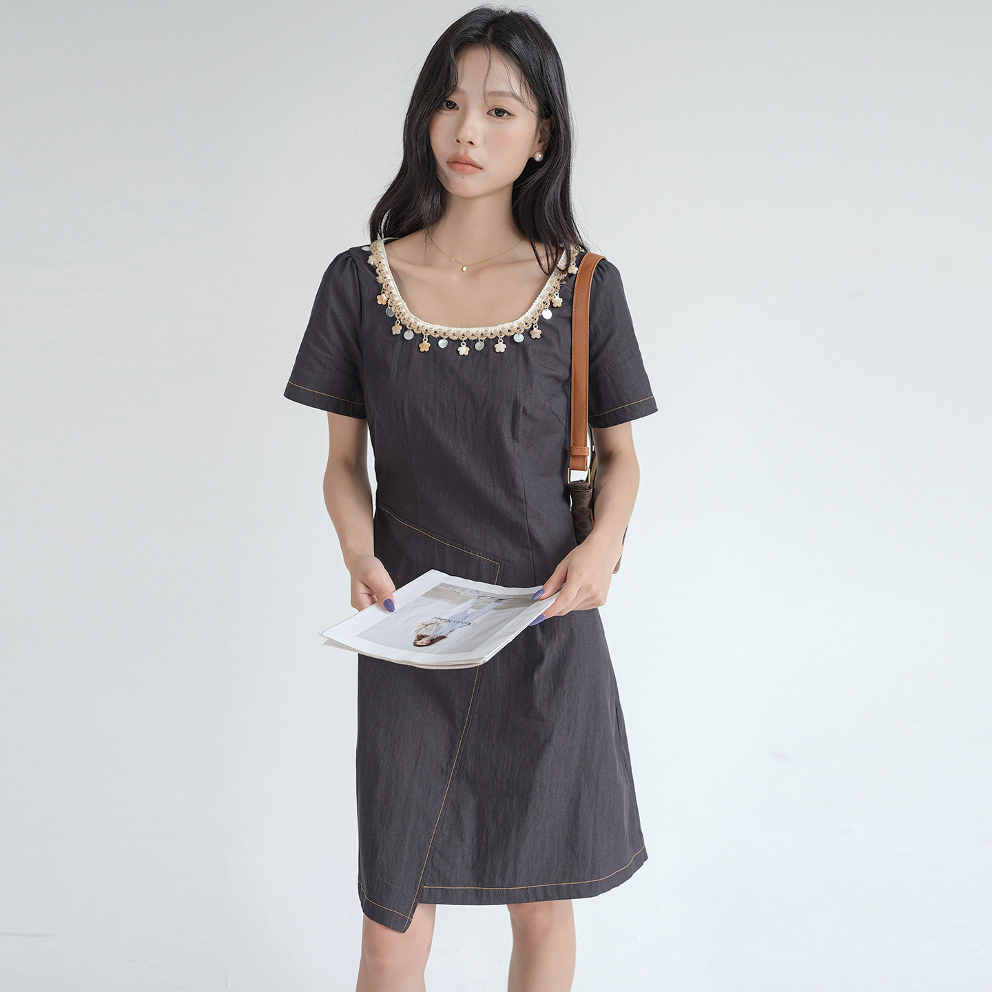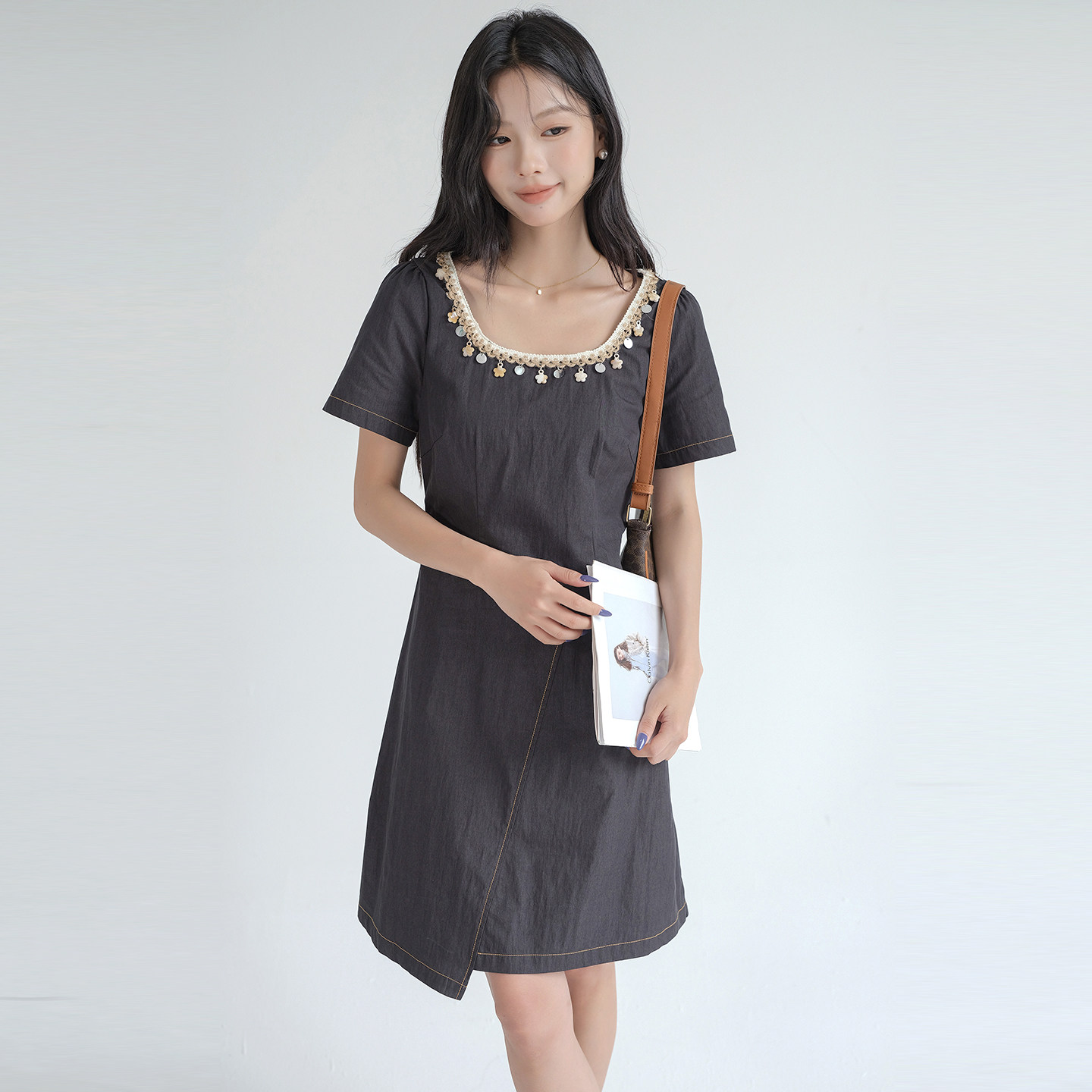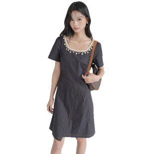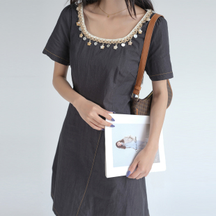 时尚 蓝若水大码 新款 胖MM2026夏装 亮片钉珠U领别致A字连衣裙YL 女装