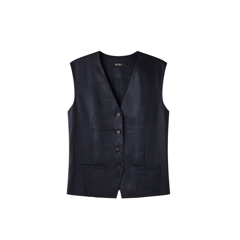 新款 尤缇2026夏季 TI藏青色亚麻V领马甲女直筒收腰外穿马夹外套